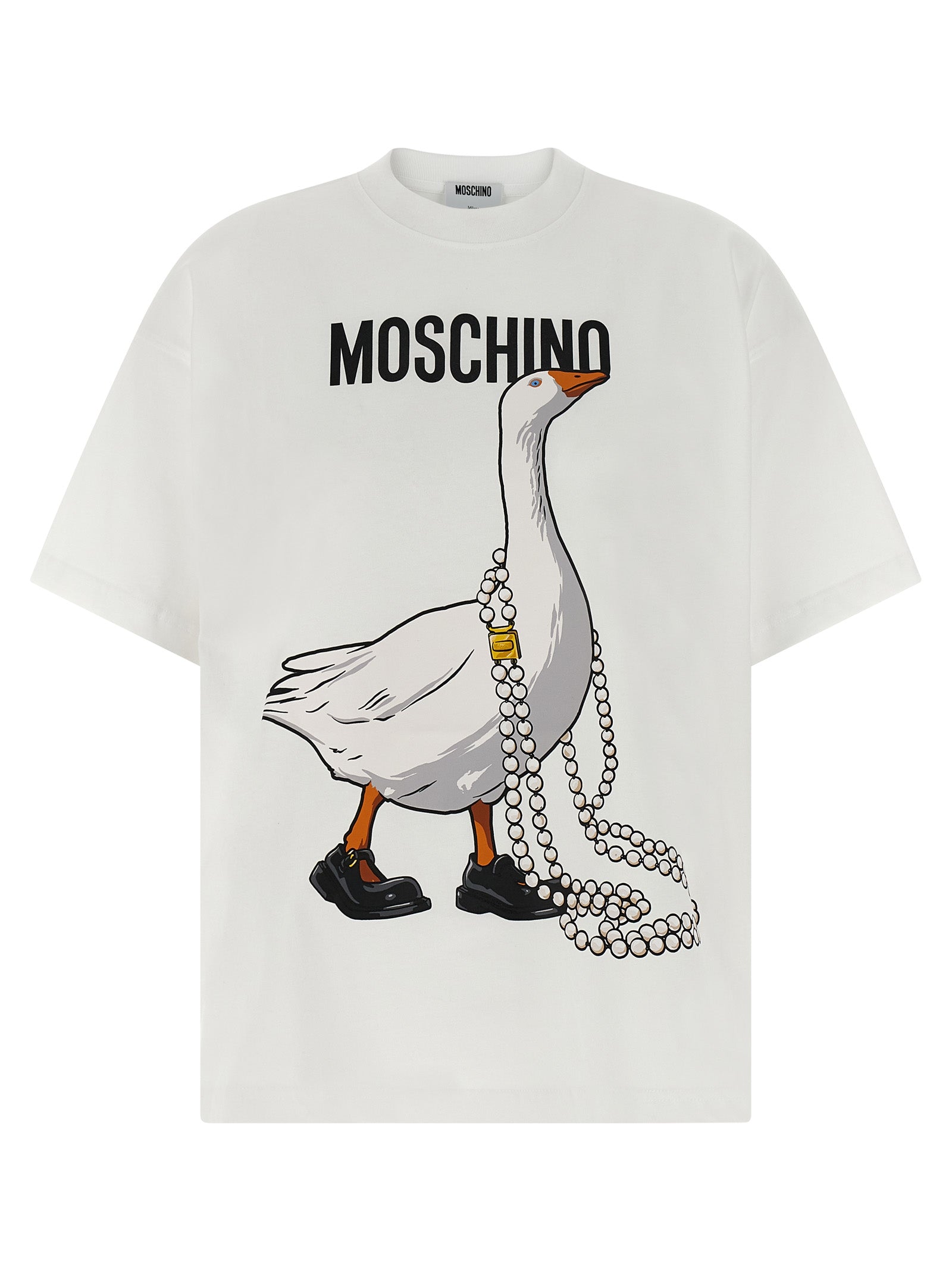 Make a playful statement with this Moschino 'Goose' T-shirt, featuring a whimsical graphic print that showcases the brand's signature irreverent humor. Crafted from soft cotton jersey, this oversized tee features a charming goose adorned with pearls and the iconic Moschino logo, creating an eye-catching conversation piece.