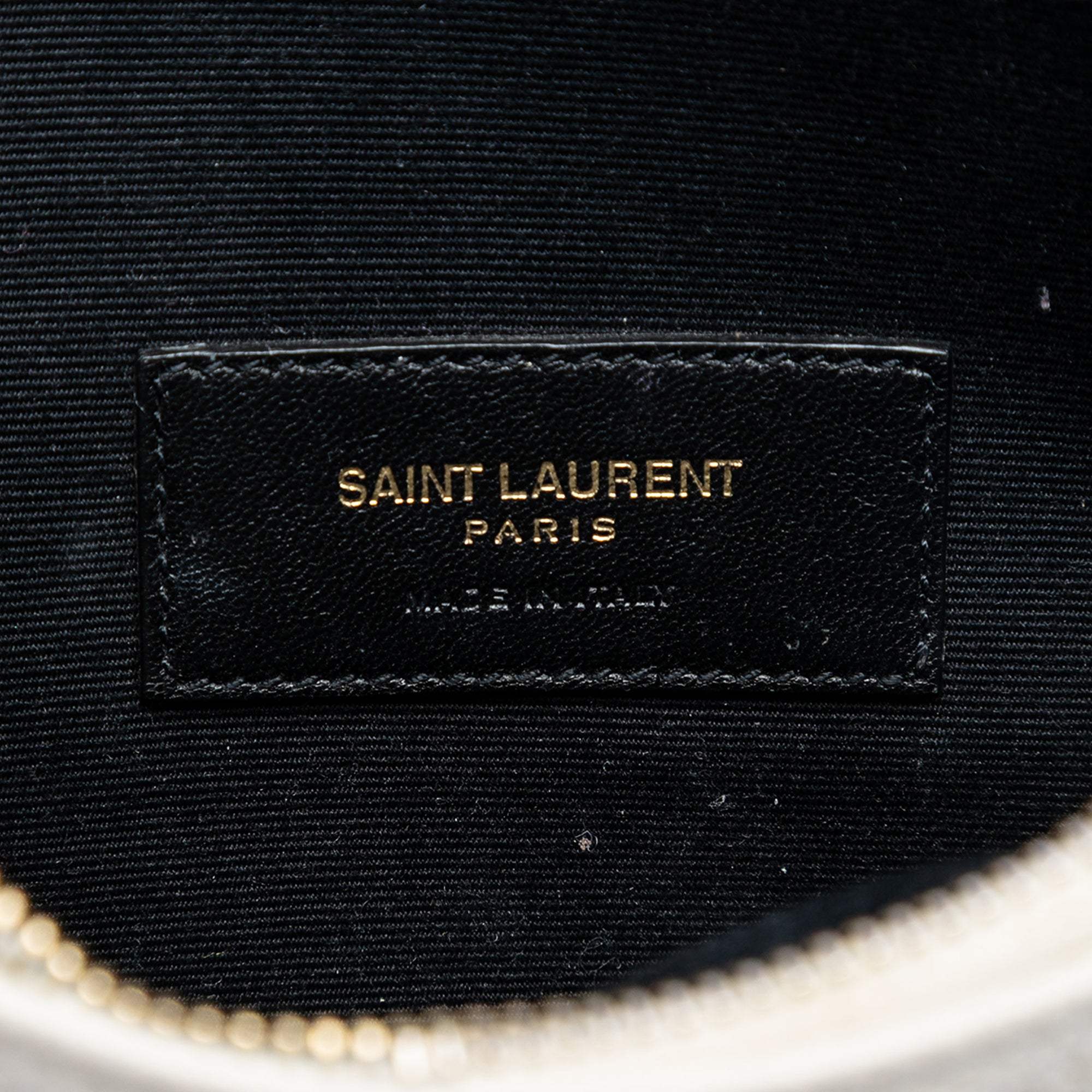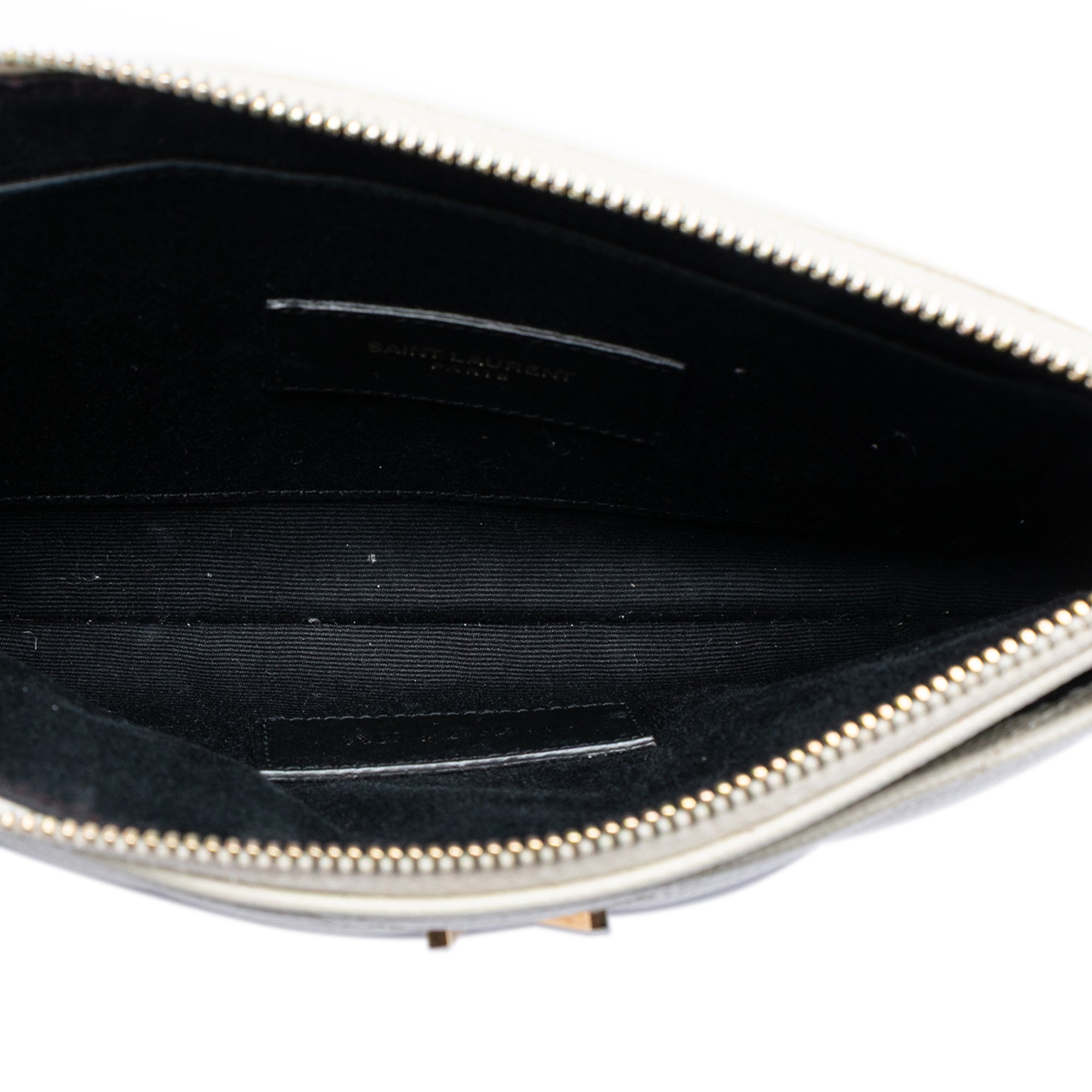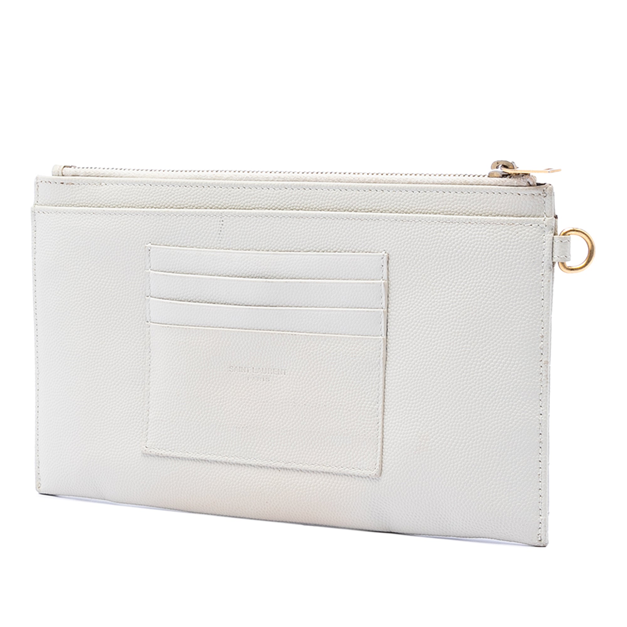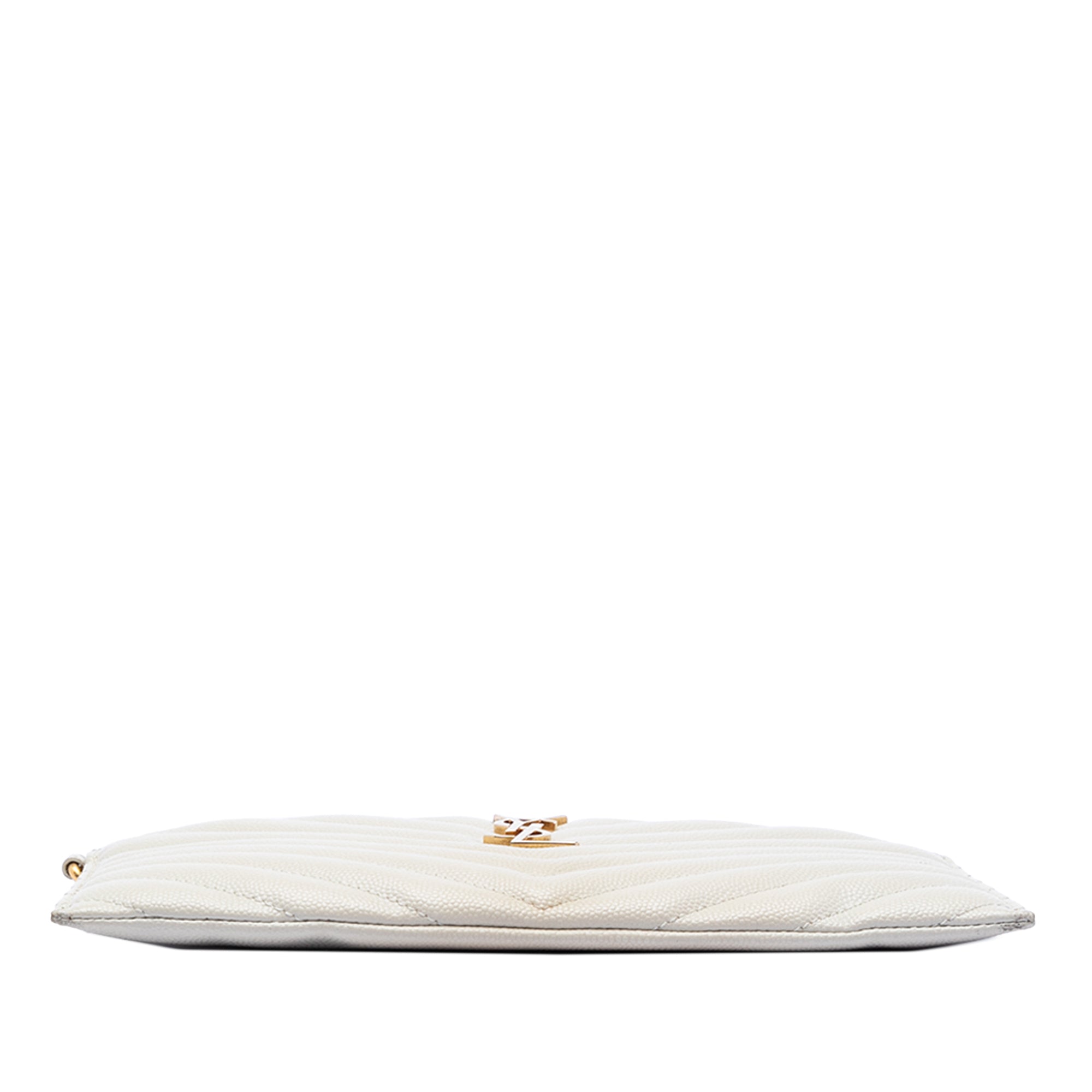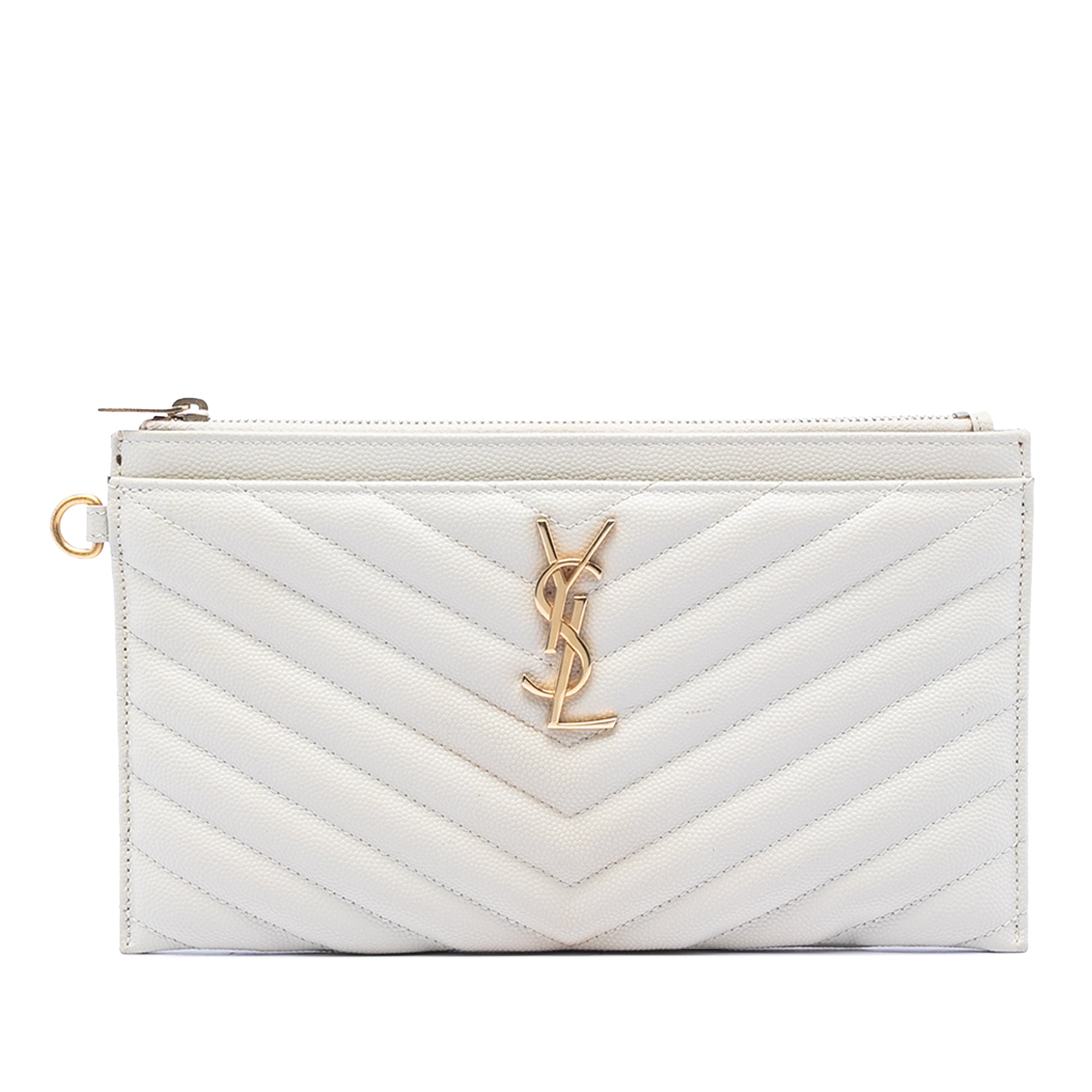 This clutch bag features a quilted leather body, a top zip closure, exterior slip pockets, and interior slip pockets.