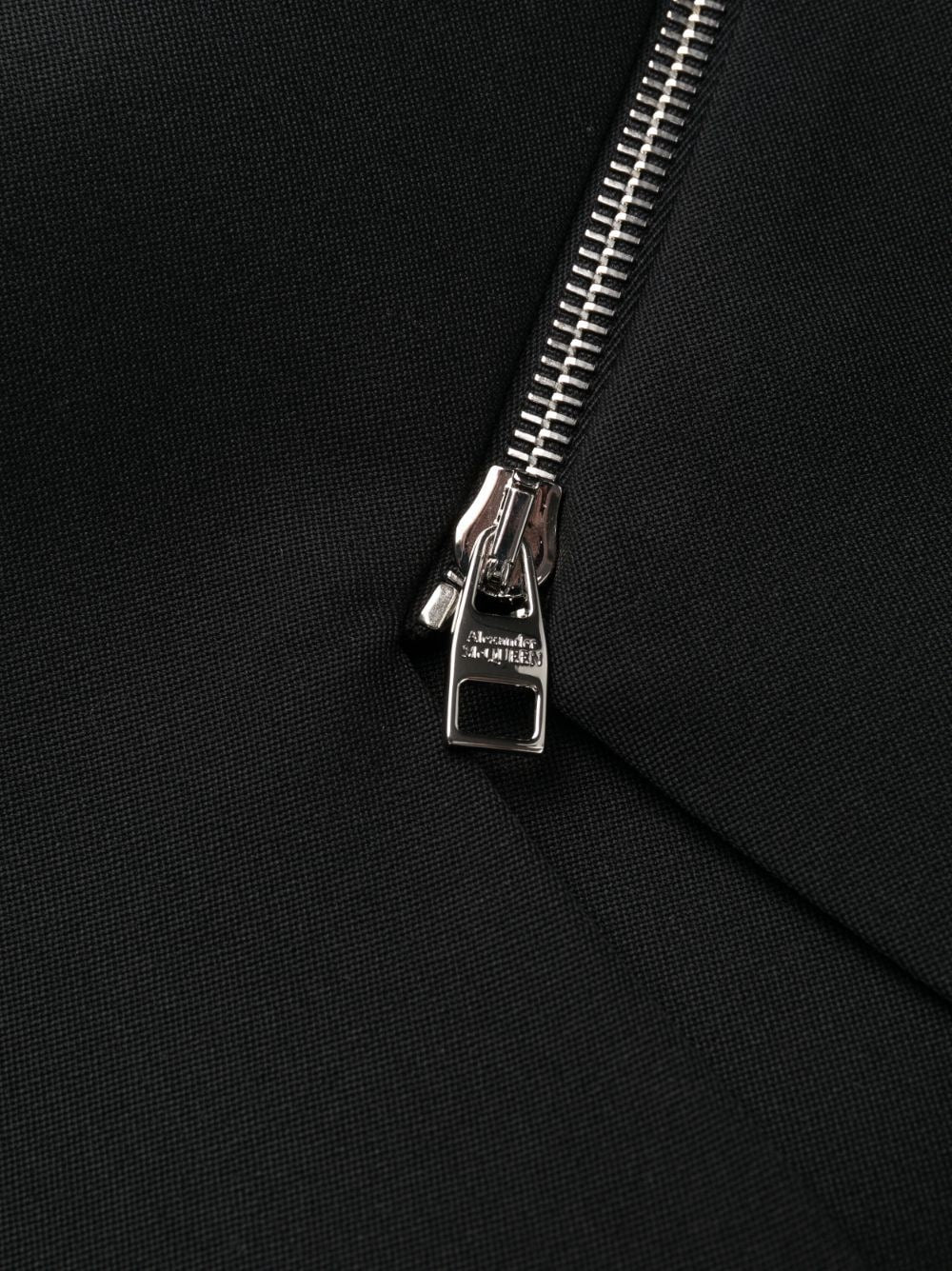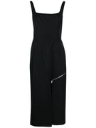 ZIP-EMBELLISHED MIDI DRESS FROM ALEXANDER MCQUEEN FEATURING BLACK, WOOL, DECORATIVE ZIP DETAILING, SQUARE NECK, CONCEALED REAR ZIP FASTENING, SLEEVELESS, SIDE SLIT AND MID-LENGTH.