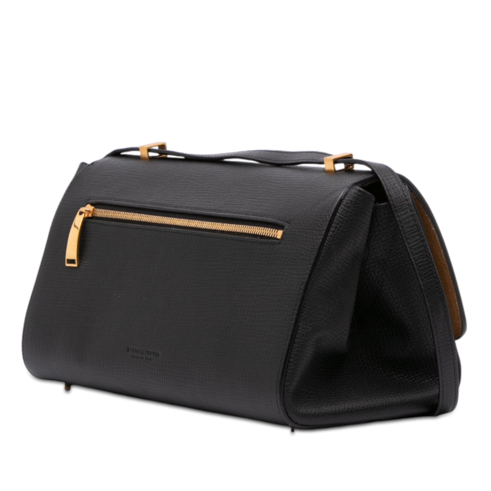 The Bottega Veneta BV Angle Shoulder Bag is a sophisticated accessory crafted from luxurious grained calfskin leather. This elegant design features a sleek leather body with a flat leather strap for comfortable wear, a front flap secured by a distinctive flip-lock closure, and thoughtful organizational details including an exterior back zip pocket and interior zip and slip pockets.
