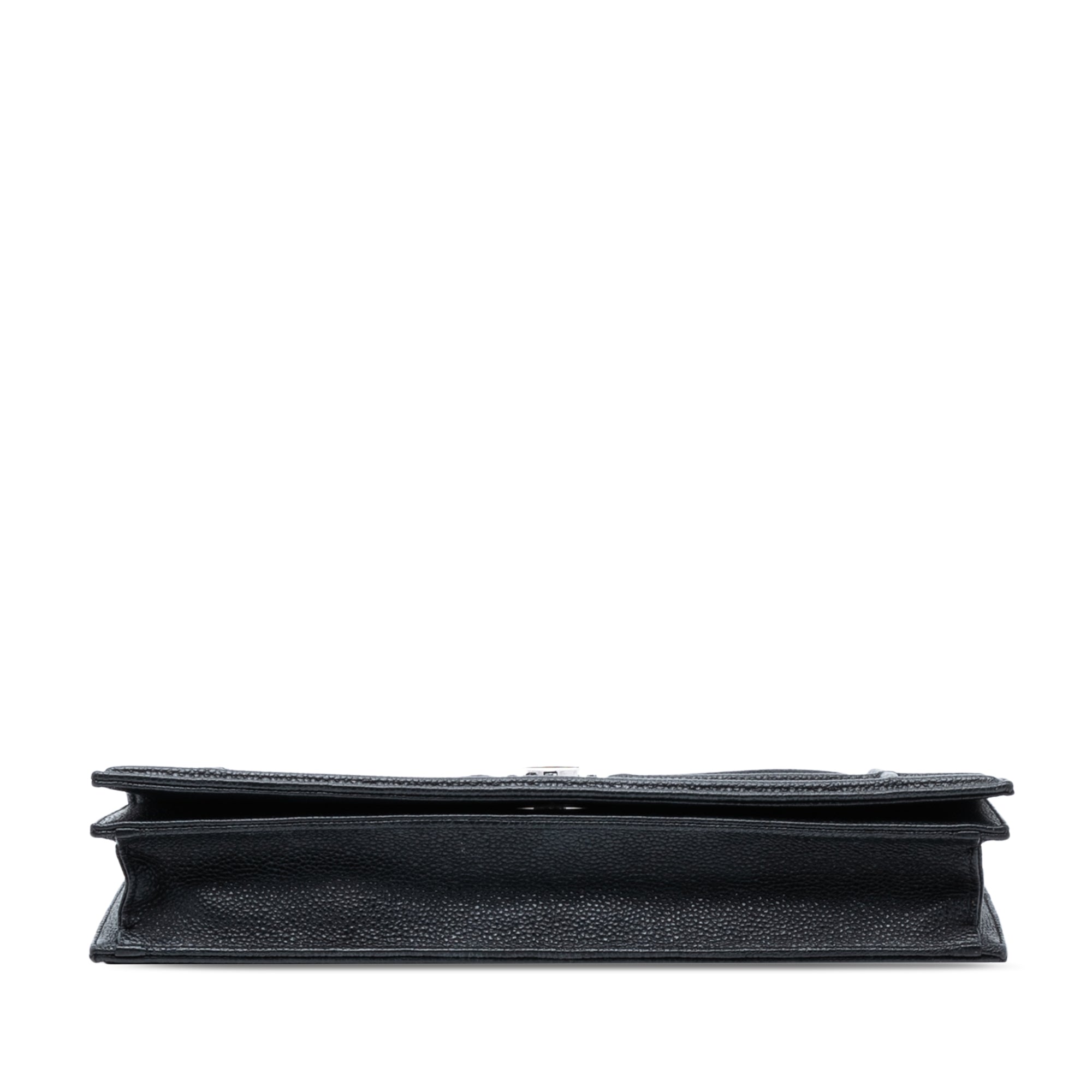 The Diorama Pochette features a grained leather body, a chain link strap, a front flap with push lock closure, and an interior slip pocket.