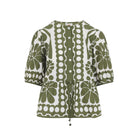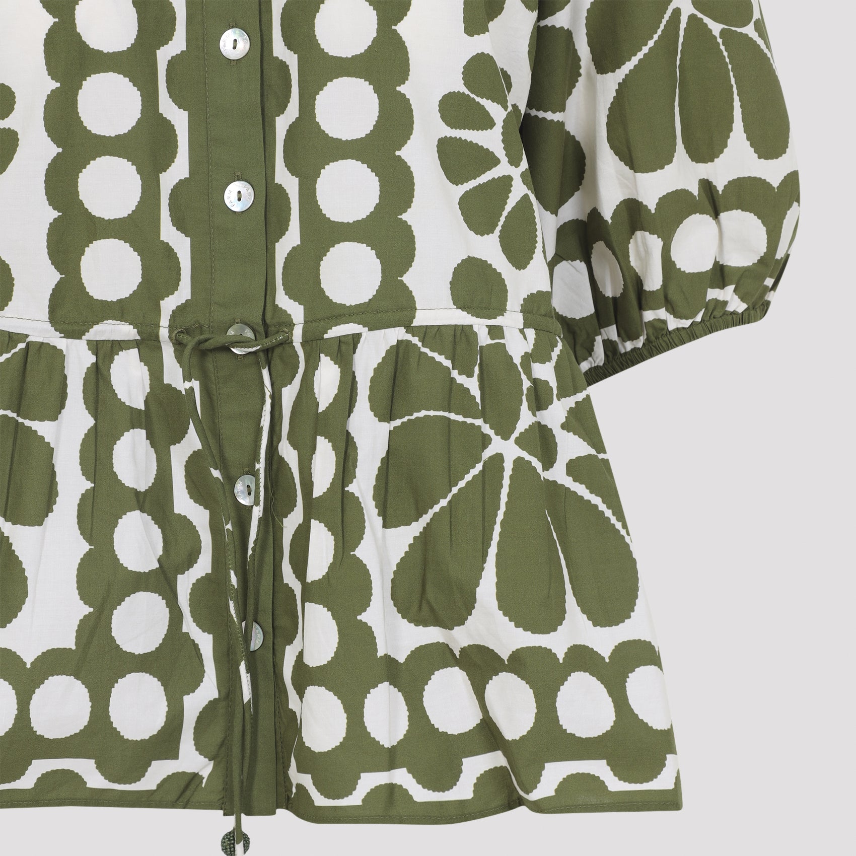 FARM RIO PALERMO GREEN COTTON SHIRT. CRAFTED FROM PURE COTTON POPLIN, IT FEATURES AN ALL-OVER GREEN AND WHITE SIGNATURE PRINT, A COLLARLESS DESIGN, FRONT BUTTON FASTENING, SHORT BALLOON SLEEVES, A TONAL DRAWSTRING AT THE WAIST, AND A FLOUNCED HEM.