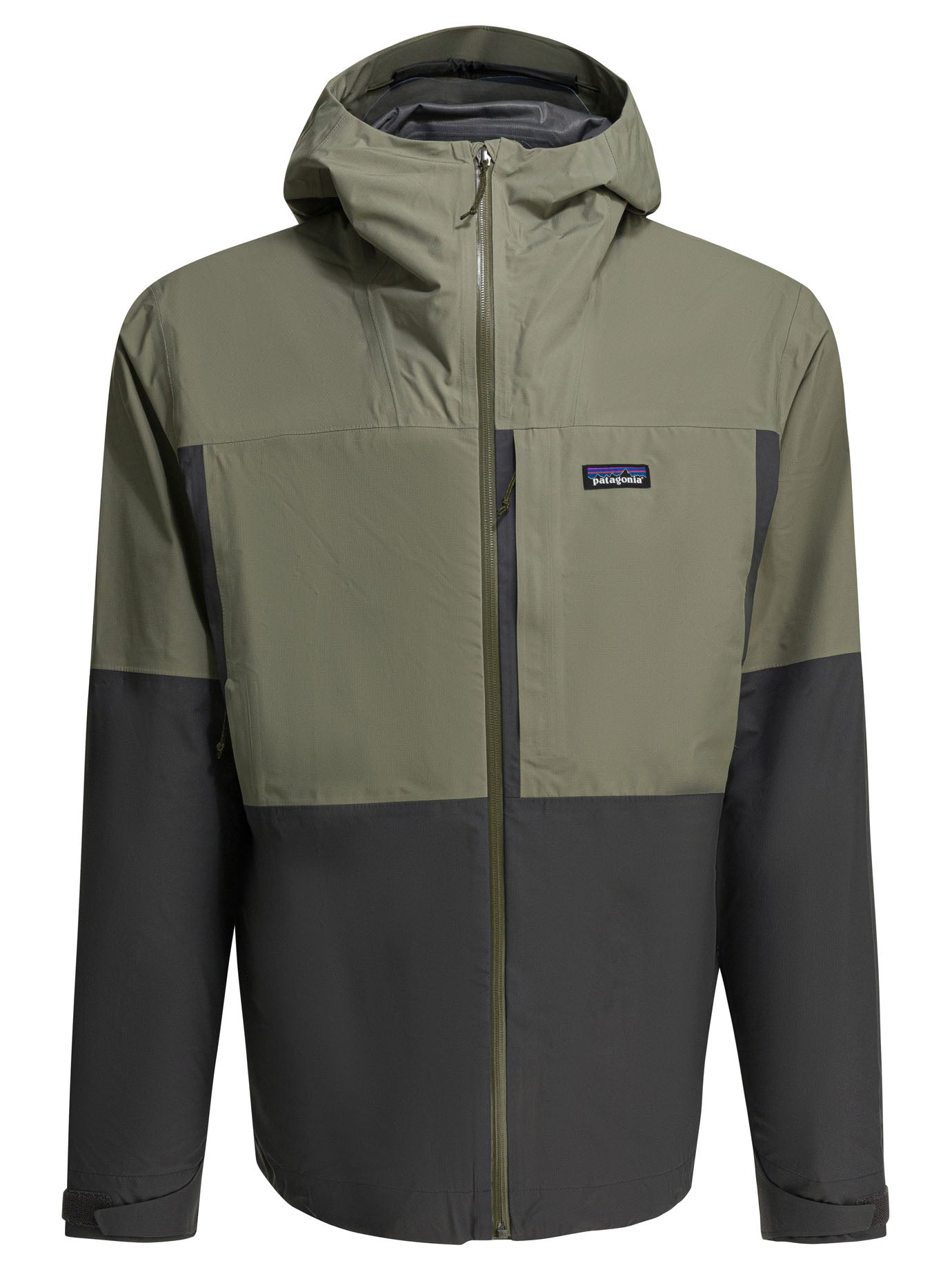 This technical rain jacket from Patagonia combines style and functionality for all your outdoor adventures. Featuring a color-blocked design in olive green and charcoal, this hooded jacket offers weather-resistant protection with a full-length front zipper.
