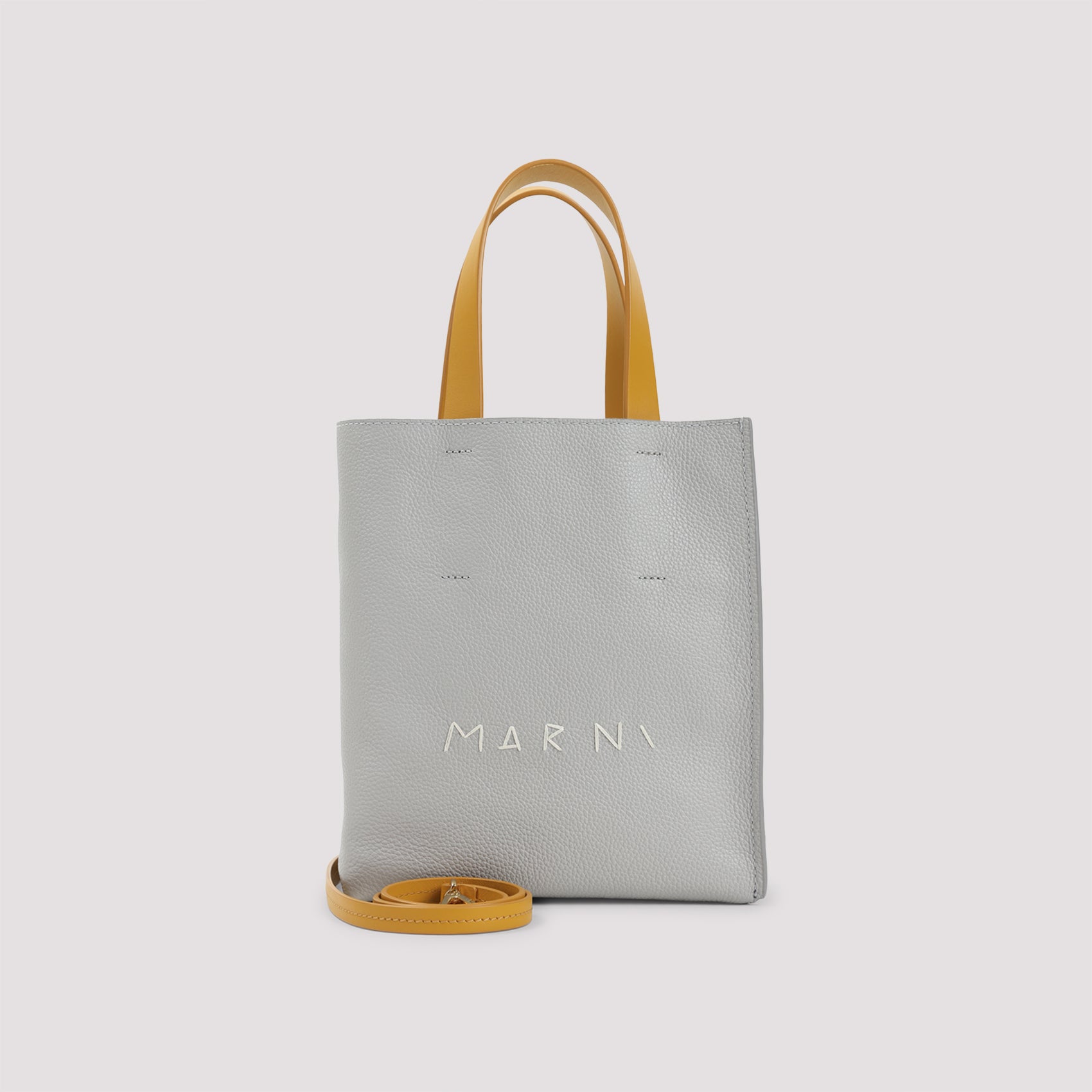 MARNI MUSEO SOFT GREY AND BLUE CHINA GRAINED CALF LEATHER MINI HANDBAG. GREY AND BLUE CHINA SOFT-GRAINED CALF LEATHER, SENAPE DOUBLE HANDLES ON THE TOP, FRONT WHITE LOGO, INNER ZIP POCKET, LINED, ATTACHABLE AND ADJUSTABLE SHOULDER STRAP.
