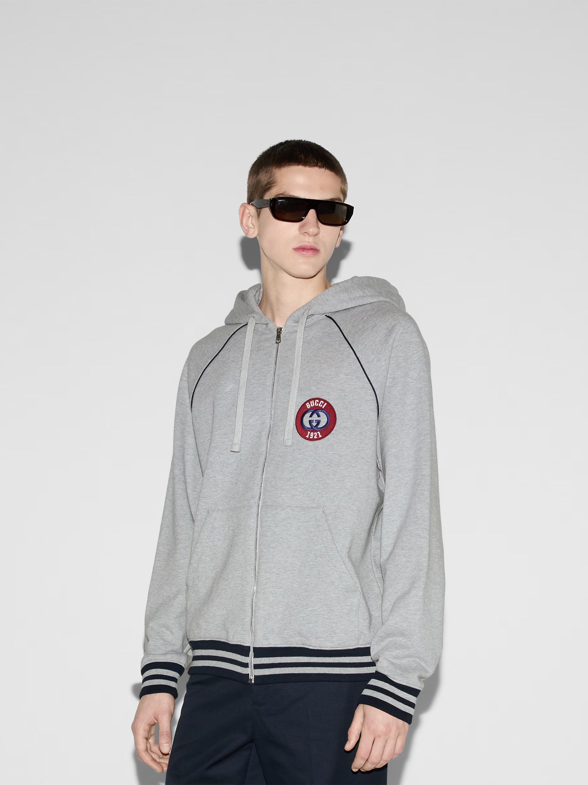Elevate your casual wardrobe with this sophisticated grey cotton full-zip hoodie from Gucci. Crafted from lightweight cotton fleece, this versatile piece features the iconic embroidered Gucci Interlocking GG 1921 patch, adding a touch of luxury to your everyday style.