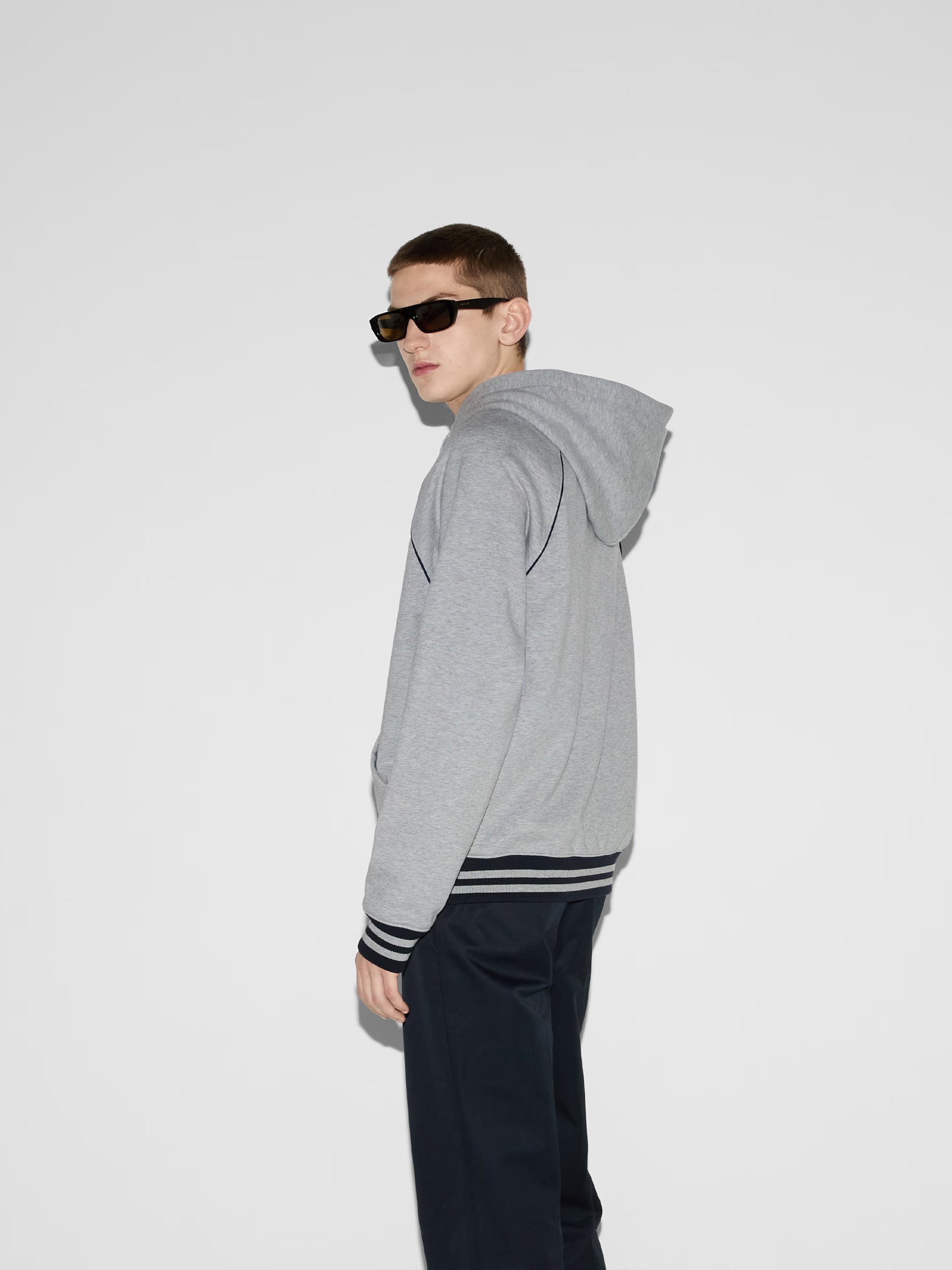 The fixed hood with drawstring and convenient front kangaroo pocket offer both functionality and comfort, while the contrast black trim and striped ribbed finishes at the cuffs and hem provide refined athletic-inspired detailing. Perfect for layering or wearing on its own, this zip-up sweatshirt effortlessly transitions from weekend errands to relaxed social gatherings.