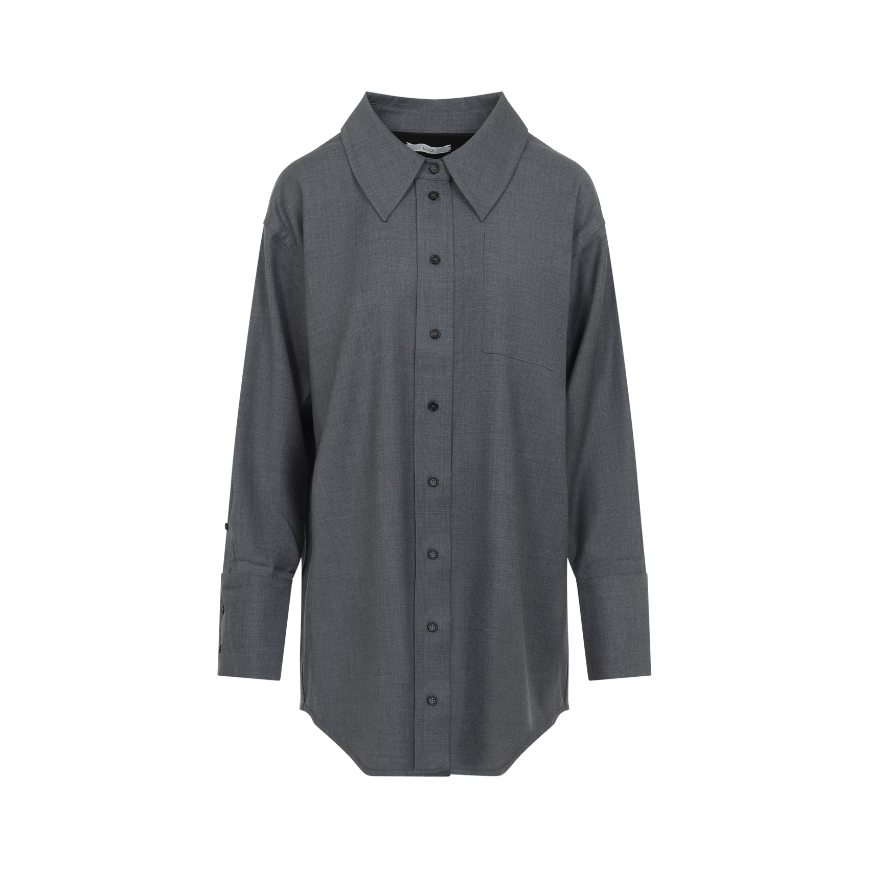 CO WOOL GREY OVERSHIRT. RELAXED-FIT OVERSHIRT CRAFTED FROM GREY MÉLANGE WOOL, FEATURING A POINTED COLLAR, FRONT BUTTON FASTENING, DROPPED SHOULDERS, LONG SLEEVES WITH BUTTONED CUFFS, A PATCH POCKET ON THE CHEST, A BACK YOKE AND A ROUND HEM.