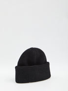 Ribbed knit beanie in black color. Features grosgrain logo on the front, contrasting folded brim.