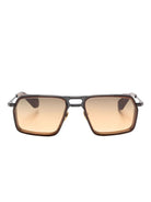 Introducing the "GT-R" Sunglasses by JACQUES MARIE MAGE, a bold statement piece that combines automotive-inspired design with luxury eyewear craftsmanship. These square-framed sunglasses feature gradient lenses that transition from rich brown to warm amber tones, offering both style and superior UV protection.