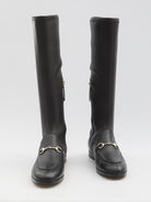 Gucci Jordaan boots in black stretch leather. They feature a light gold Horsebit detail on the toe, side zip closure with a leather pull tab embossed with the logo, and a leather sole. Dust bag included. Any leather imperfections are not to be considered manufacturing defects, but a peculiarity of the material.