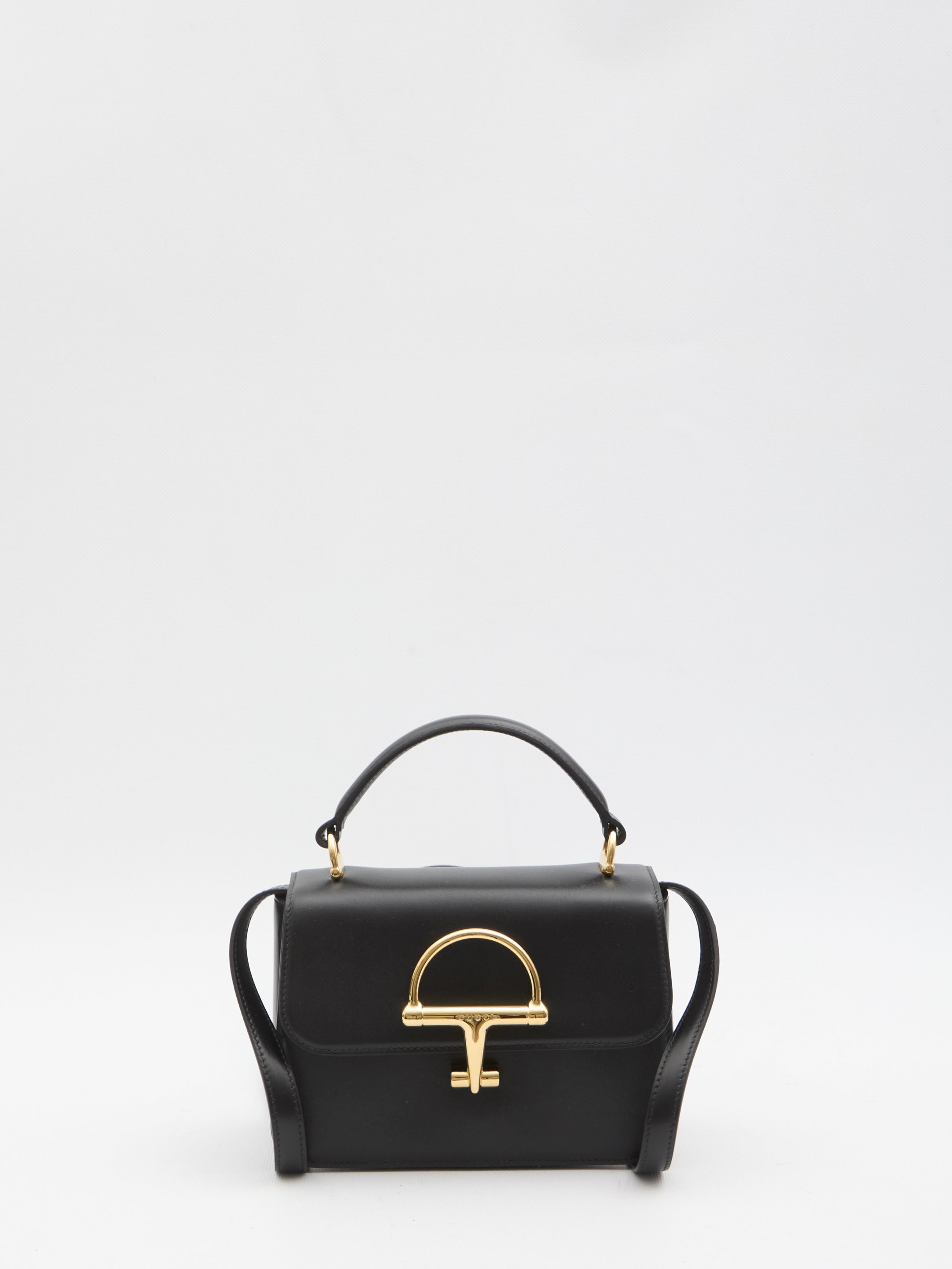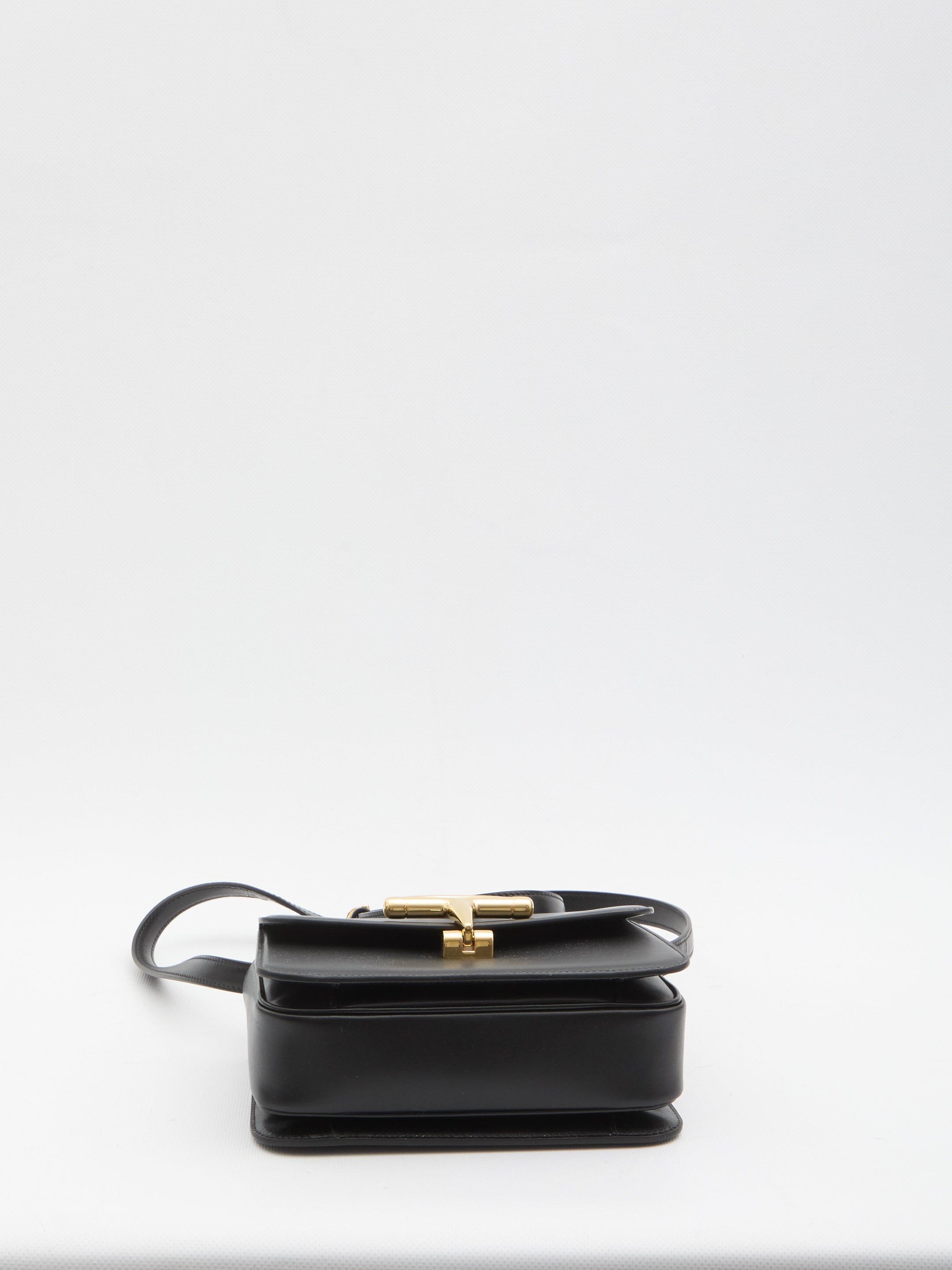 Black smooth leather bag. It features a top handle, an adjustable and removable shoulder strap, a snap closure with a clasp, a gusseted interior with three compartments and one open pocket, black leather lining. Dustbag included. Any imperfections in the leather should not be considered manufacturing defects, but rather a peculiarity of the material.