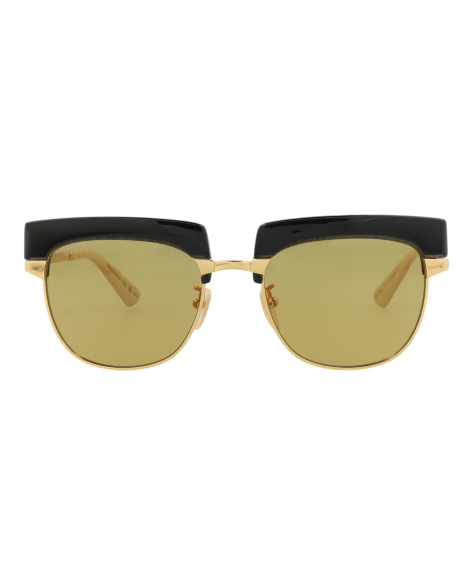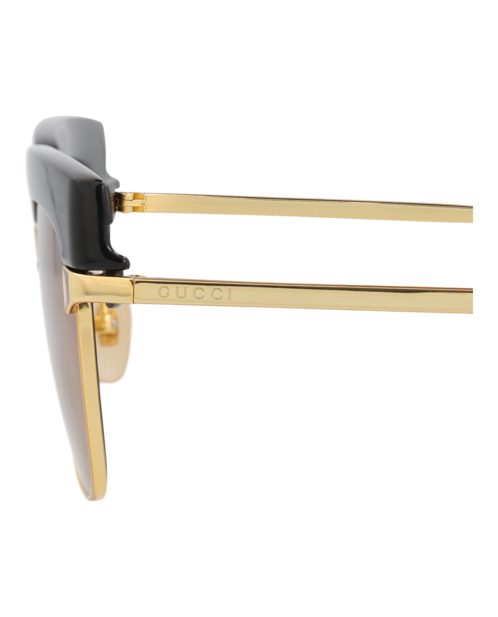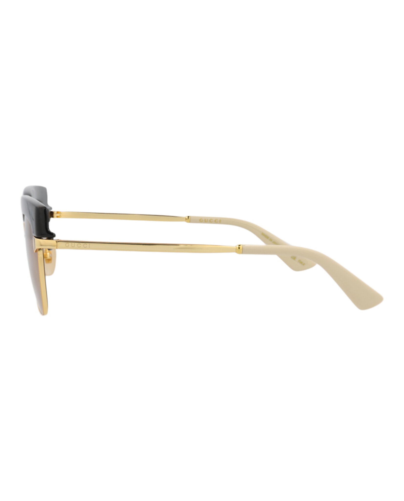 Elevate your eyewear collection with these sophisticated Gucci Square-Frame Metal Sunglasses. Crafted in Japan with meticulous attention to detail, these sunglasses feature a striking square silhouette with a bold black upper frame and luxurious gold-tone metal accents.