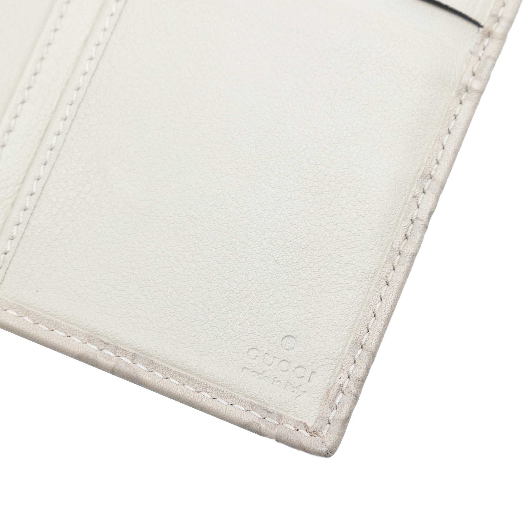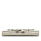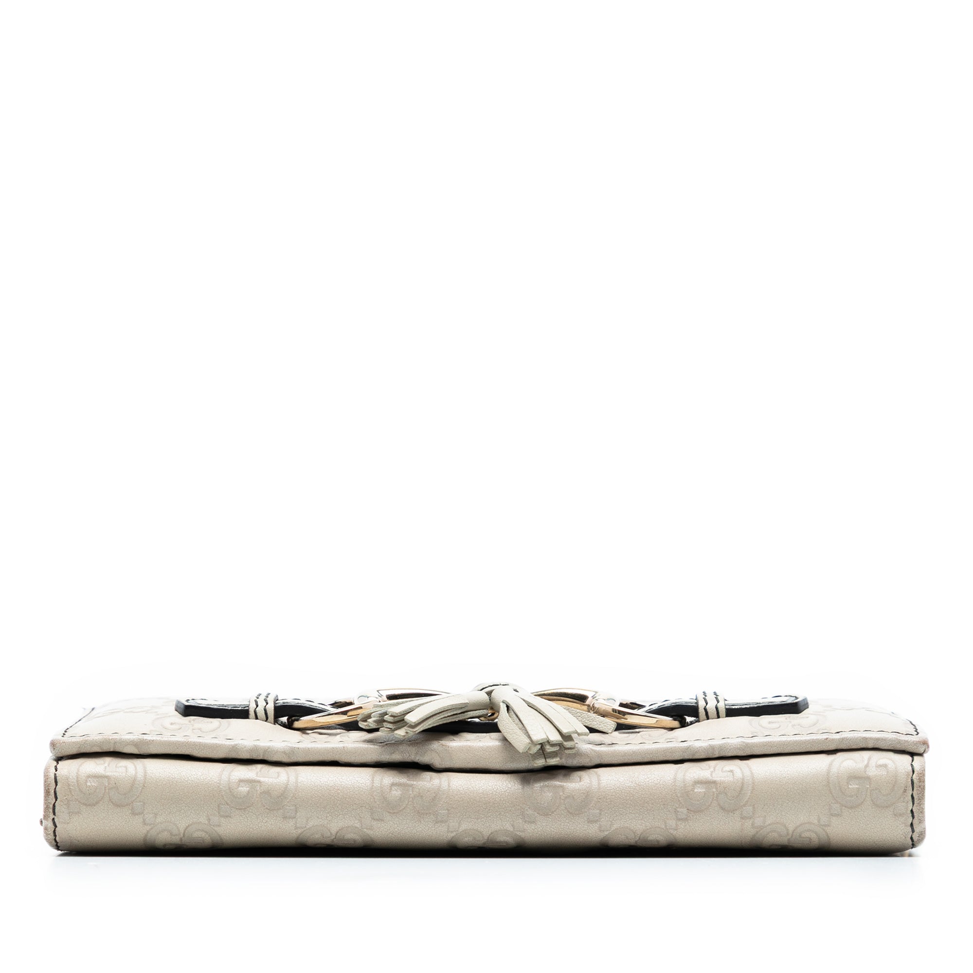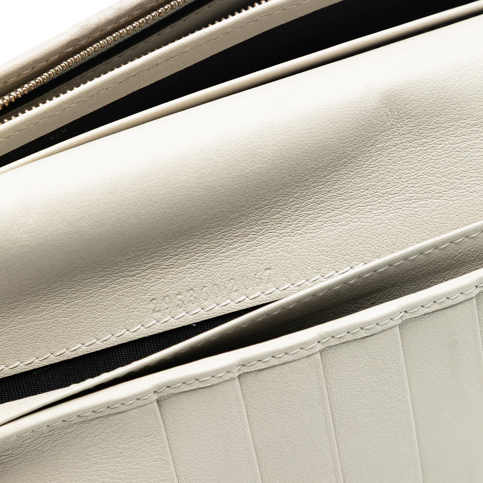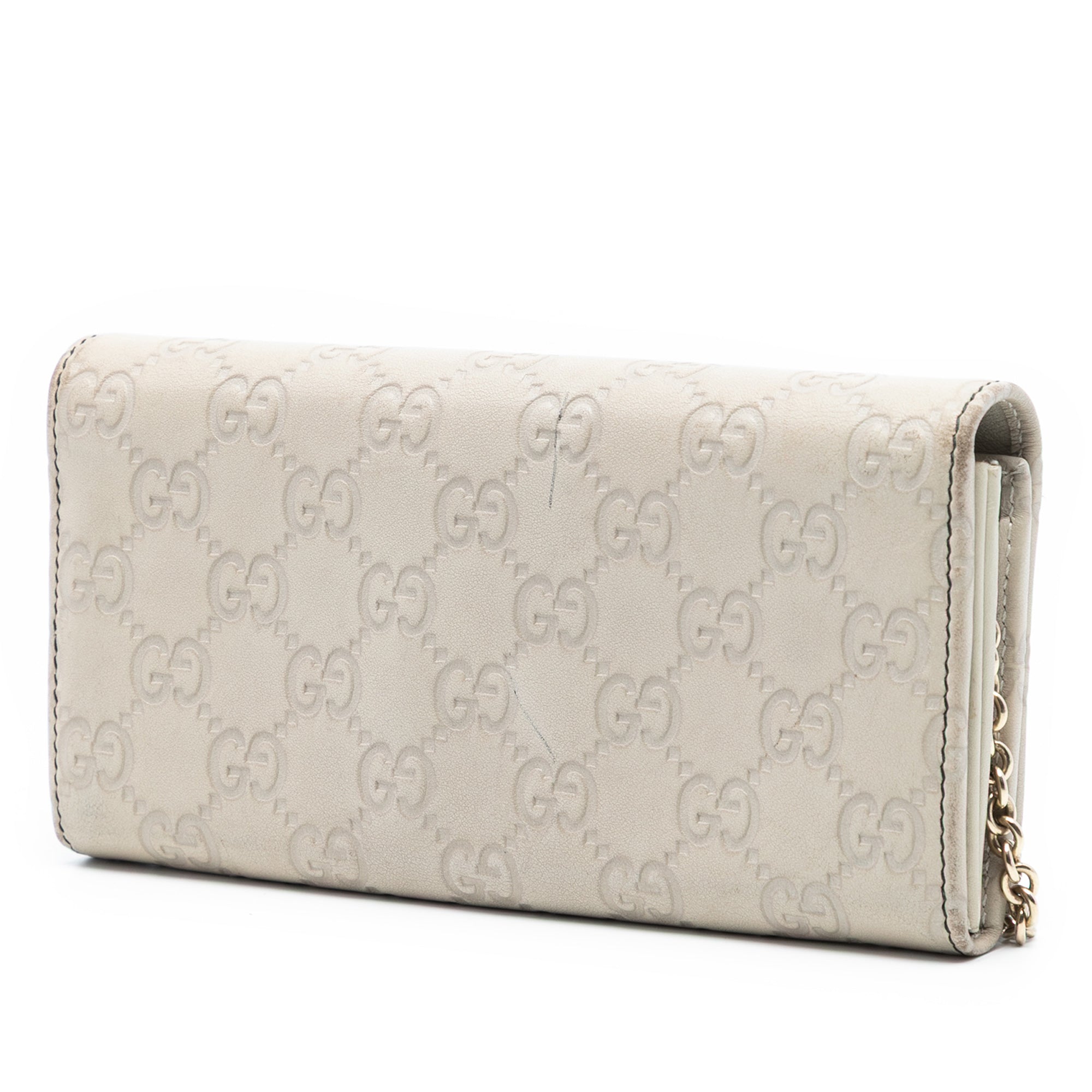This wallet on chain features an embossed leather body, a chain-link strap, a front flap with a magnetic snap button closure, and interior zip and slip pockets.