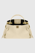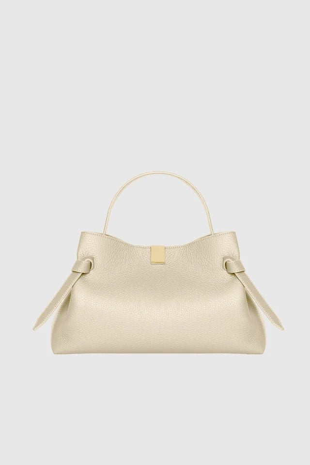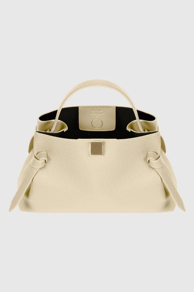This iconic dumpling-shaped bag features a beautifully structured silhouette crafted from premium leather in a versatile beige tone. The signature side knot details and elegant top handle create a distinctive look that effortlessly transitions from day to night.