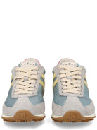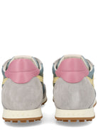 These low-top sneakers feature a sophisticated color-blocked design in soft grey and light blue tones, accented with a playful pink heel detail and the signature yellow H logo. The lace-up fastening ensures a secure fit, while the heel pull tab makes them easy to slip on and go.