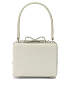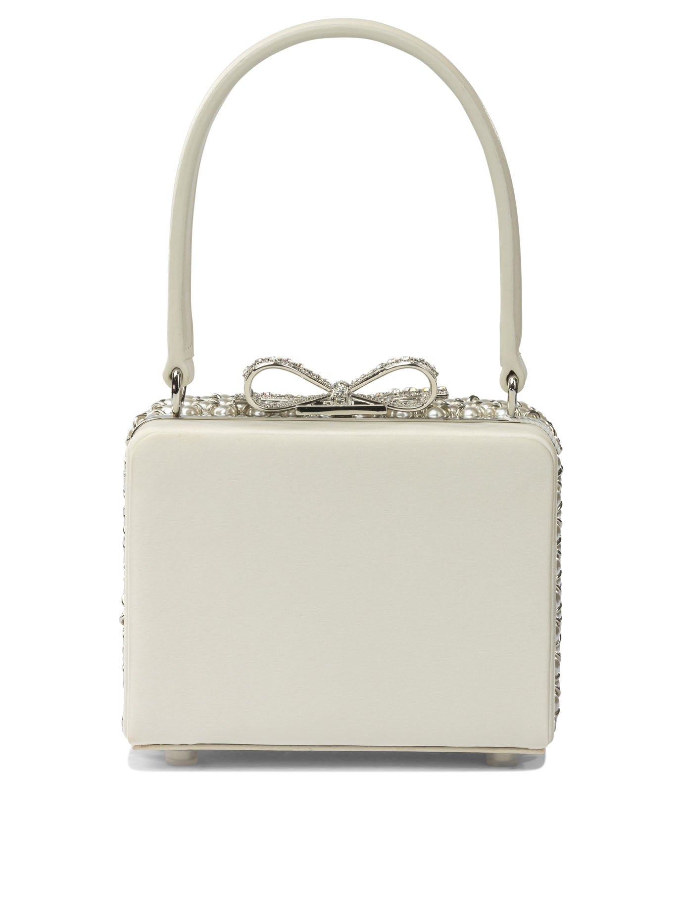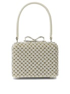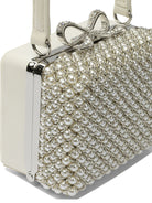 Self-portrait pearl handbag with rigid structure, decorated with a pearl appliqué finish throughout. The design includes a top handle made of smooth leather that provides grip. It features a decorative bow detail on the front. The top closure is snap for quick access to the interior compartment.