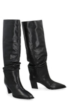 THE BOOT IS CHARACTERIZED BY A SLENDER SILHOUETTE. MADE OF SHINY CALFSKIN, IT FEATURES A SCULPTURAL OBLIQUE WIDE HEEL OF 6 CM CHARACTERIZED BY A FACETED AND TRIANGULAR CUT. PERFECT TO MATCH WITH OUTFITS BOTH CASUAL AND FORMAL.