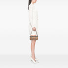 This shoulder bag features a haymarket check coated canvas body with leather trim, a chain link shoulder strap, and a top zip closure.