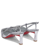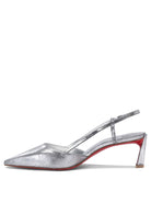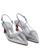 Elevate your style with these stunning metallic slingback heels from Christian Louboutin. Crafted in luxurious silver leather with the iconic red sole, these sophisticated pumps feature a pointed toe silhouette and a comfortable block heel that provides both elegance and stability.