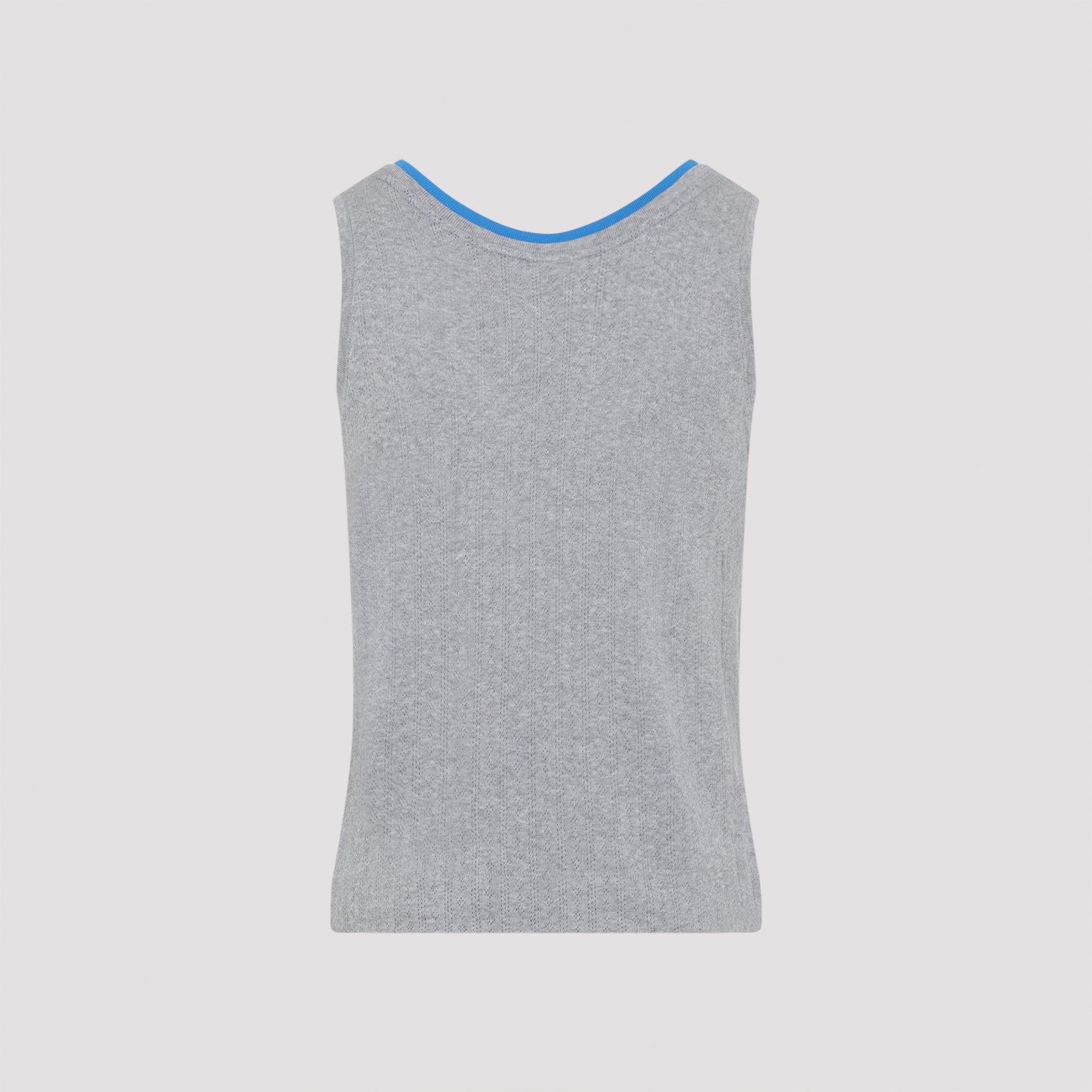 Elevate your everyday essentials with the Heffman Bis Tank Top by Dries Van Noten. Crafted from 100% premium cotton, this sleeveless tank features a classic ribbed texture in soft gray, beautifully accented with vibrant blue contrast trim along the neckline and armholes.