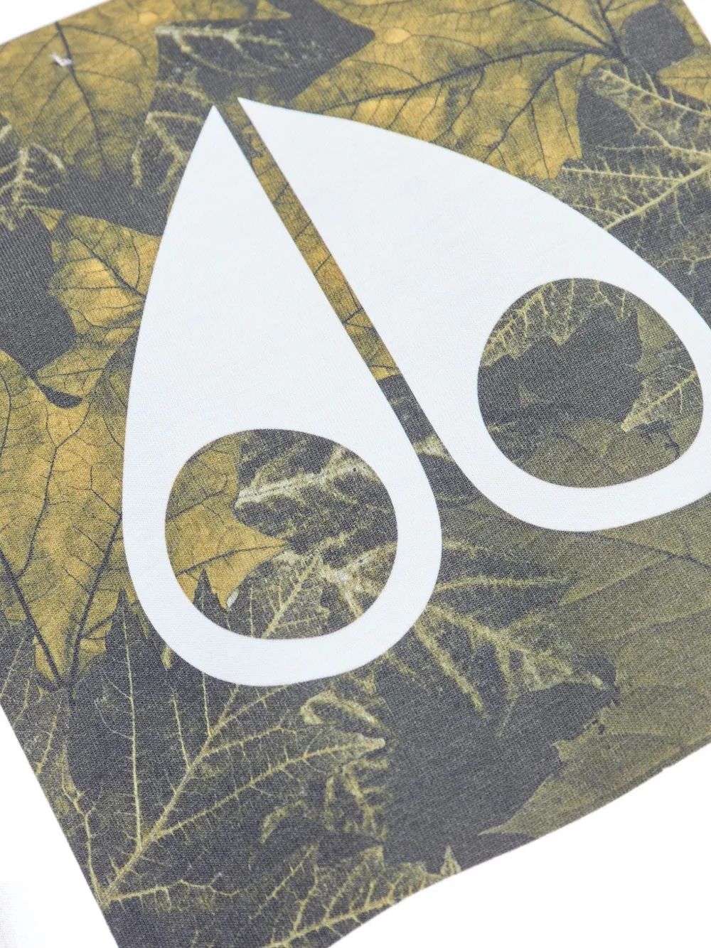 Elevate your casual wardrobe with the Hemlock Tee from Moose Knuckles. This premium white t-shirt features a striking graphic design that combines the brand's iconic geometric logo with an artistic nature-inspired backdrop in rich gold and gray tones.