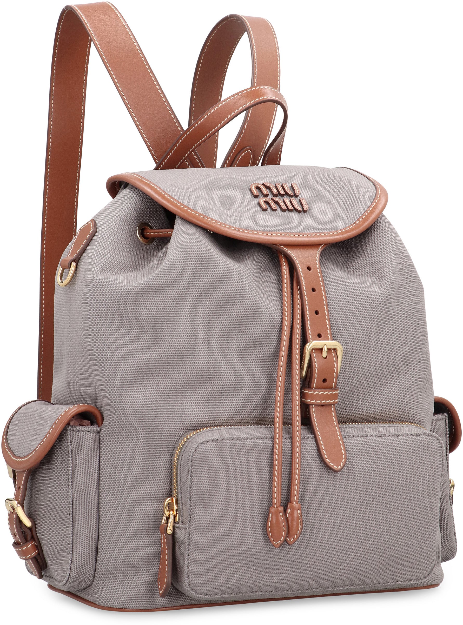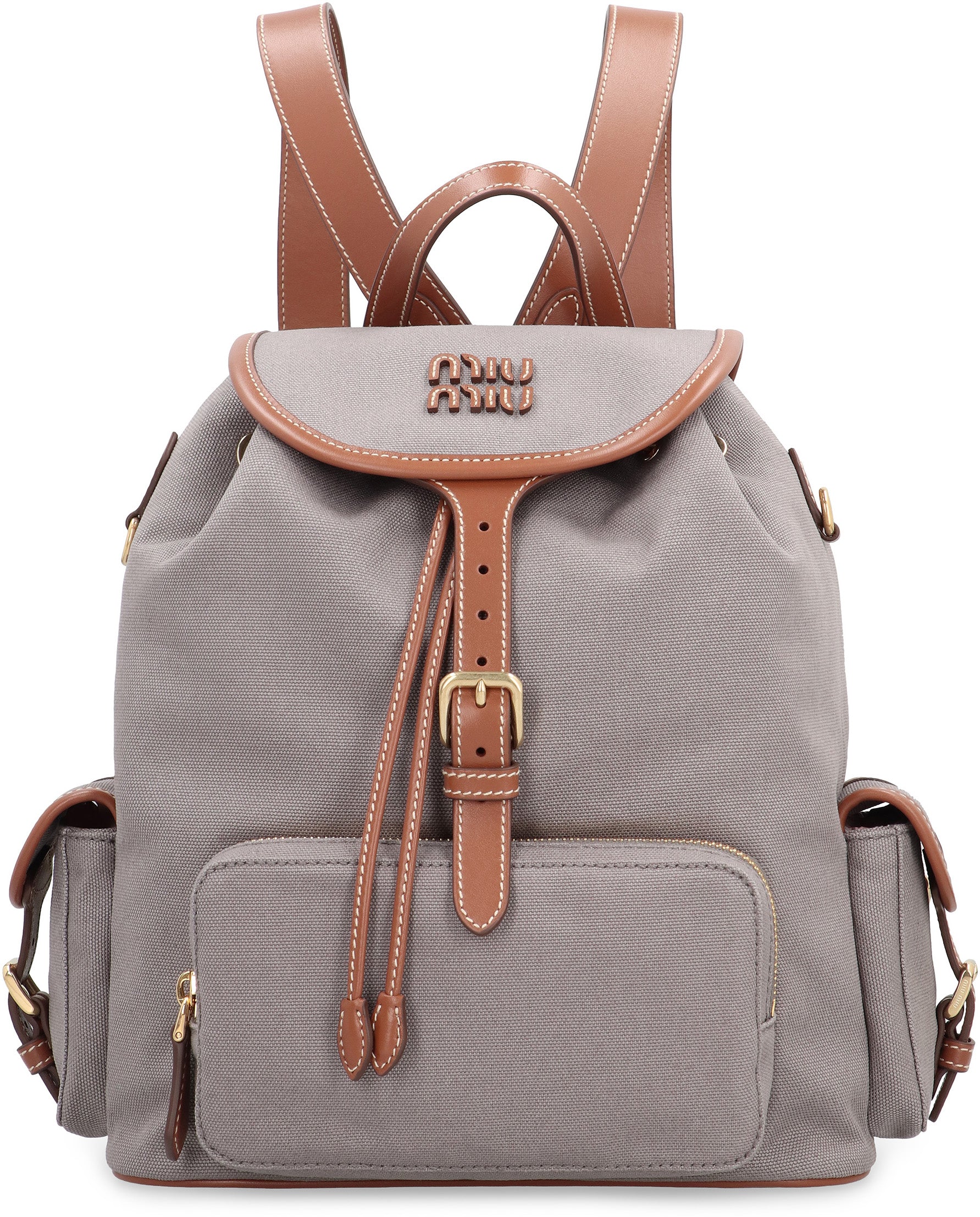 MODEL MADE OF GRAY FABRIC WITH CONTRASTING LEATHER DETAILS. FEATURES ADJUSTABLE SHOULDER STRAPS AND A TOP CLOSURE WITH BUCKLE, TO ENSURE COMFORT AND SAFETY. INCLUDES A FRONT POCKET AND TWO SIDE POCKETS WITH FLAP. LOGO DETAIL ON THE FRONT. THE INSIDE FEATURES A POCKET WITH ZIPPER. HARDWARE IN GOLD METAL.