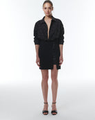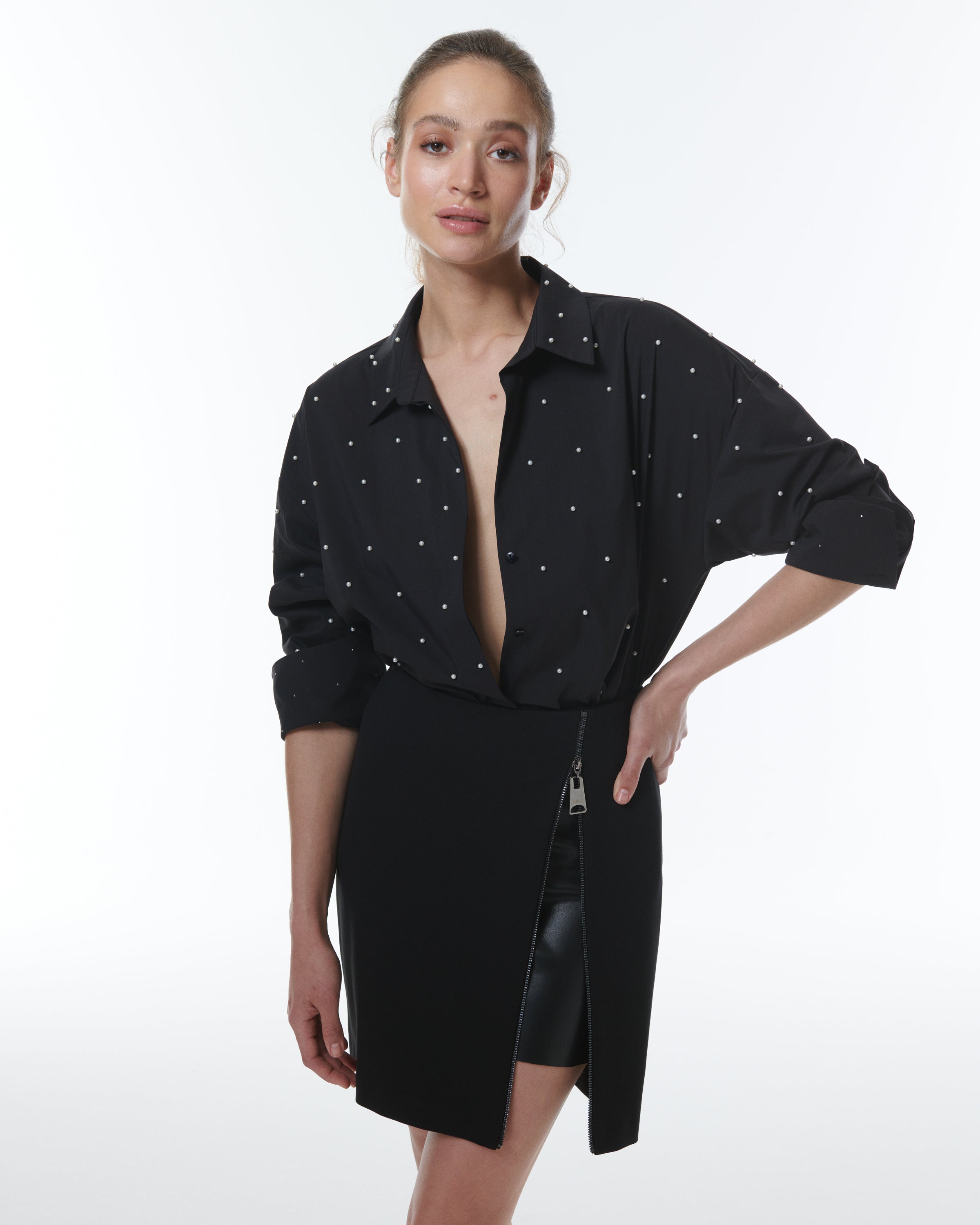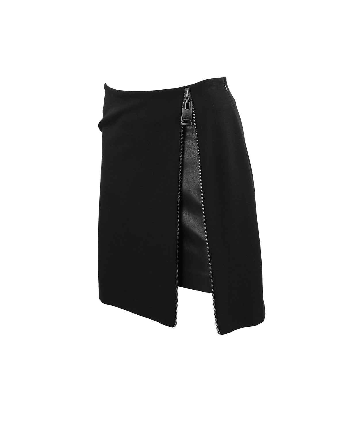 Unleash your edgy side with our Hera Layered Vegan Leather Mini Skirt. This black mini skirt features a front zip, revealing a slick layer of vegan leather. Perfect for a night out or adding some attitude to your everyday look.