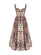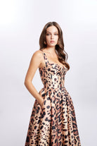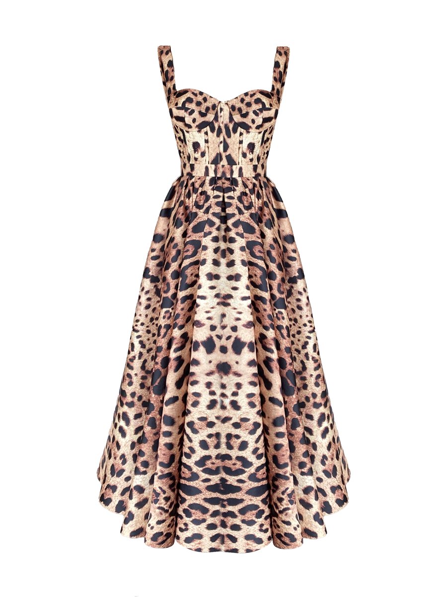 Drawing attention with its bold and assertive style, Hermia dress becomes the symbol of femininity with its leopard patterns. The corset top design creates a slim silhouette by tightly hugging the body, while the wide skirt cut offers elegance and comfort together. With its luxurious satin fabric and eye-catching pattern, this dress is the perfect choice for many occasions, from special events to dinners. The leopard print offers a classic style that never goes out of style, while the modern cut remains a favorite of every era.