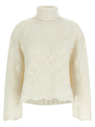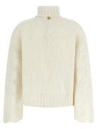 Elevate your knitwear collection with this luxurious high neck sweater from TWIN SET. Crafted from a sumptuous blend of wool, viscose, and cashmere, this pullover features a sophisticated turned-up turtleneck and elegantly flared long sleeves with dropped shoulders for a relaxed yet refined silhouette.