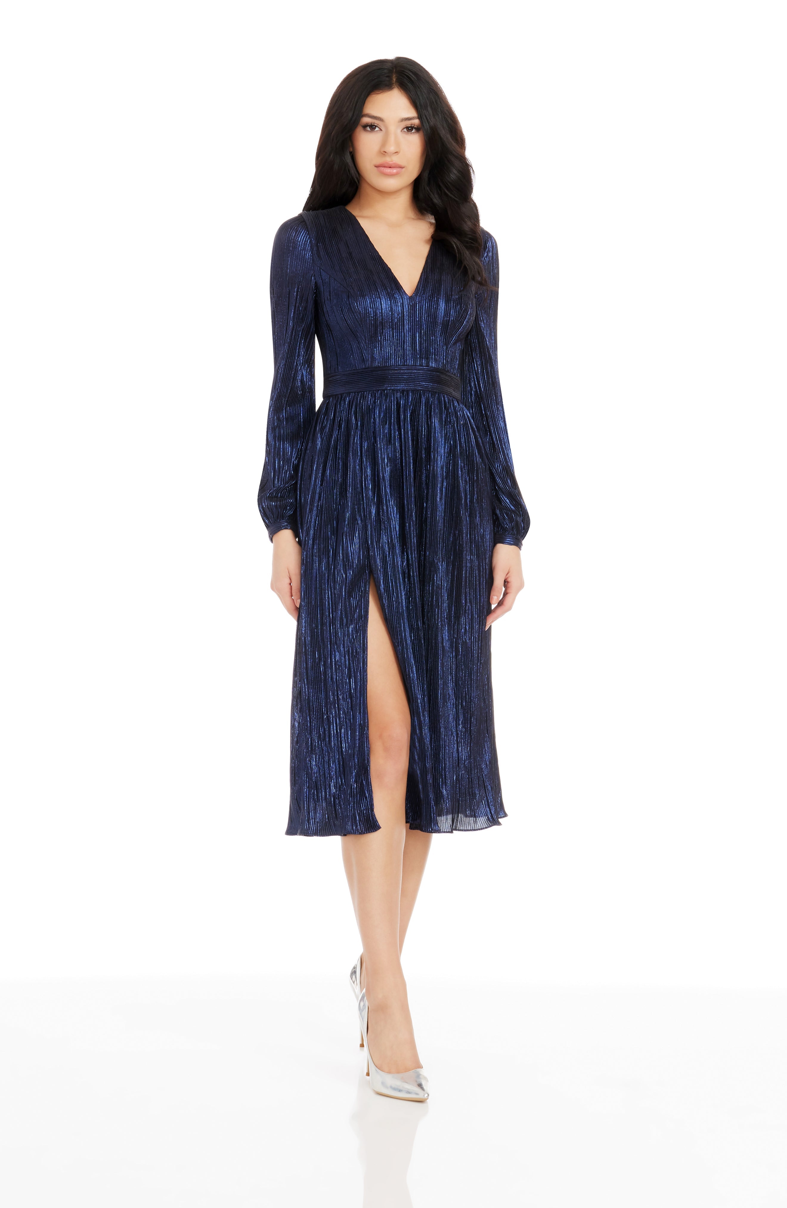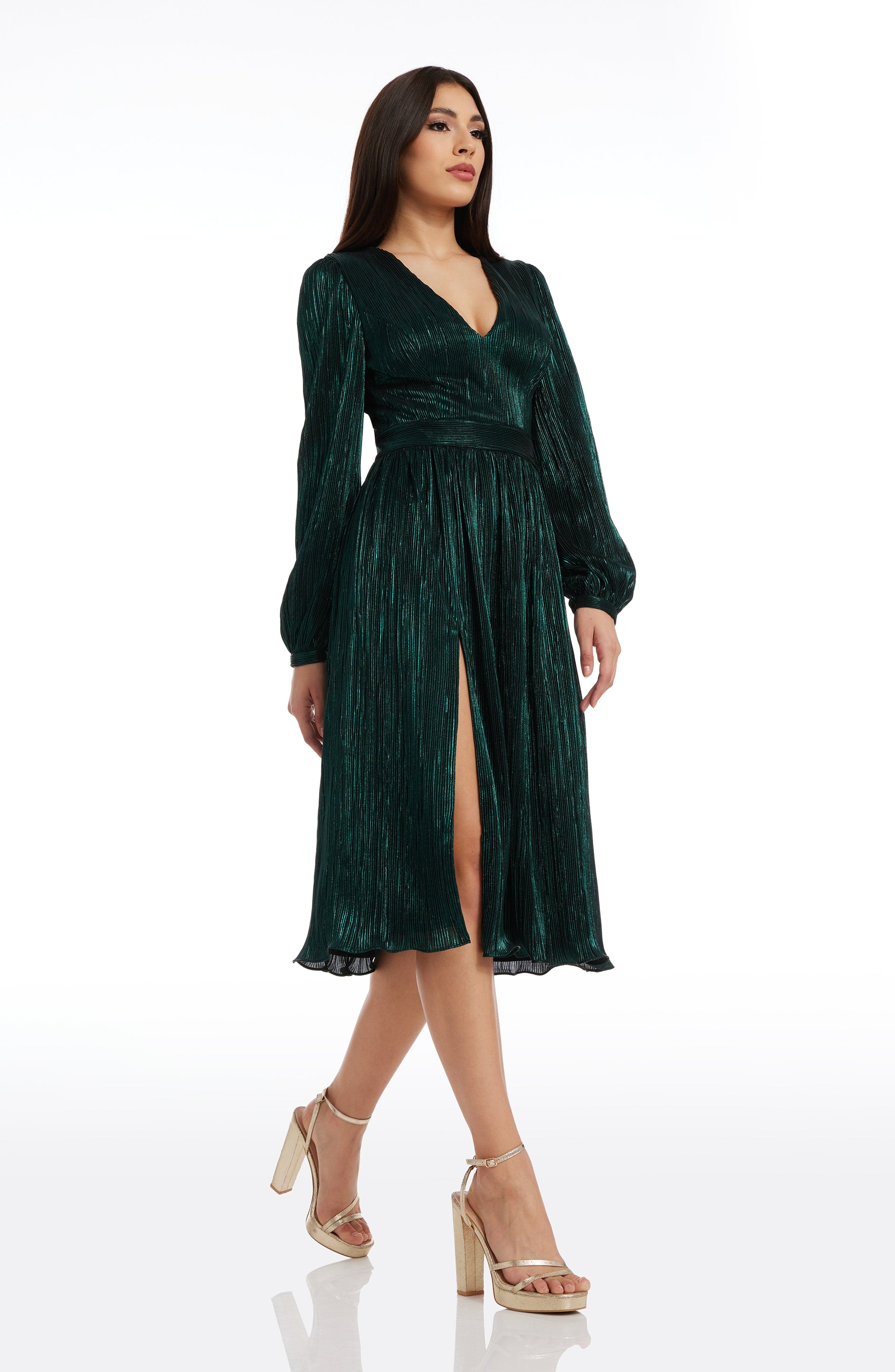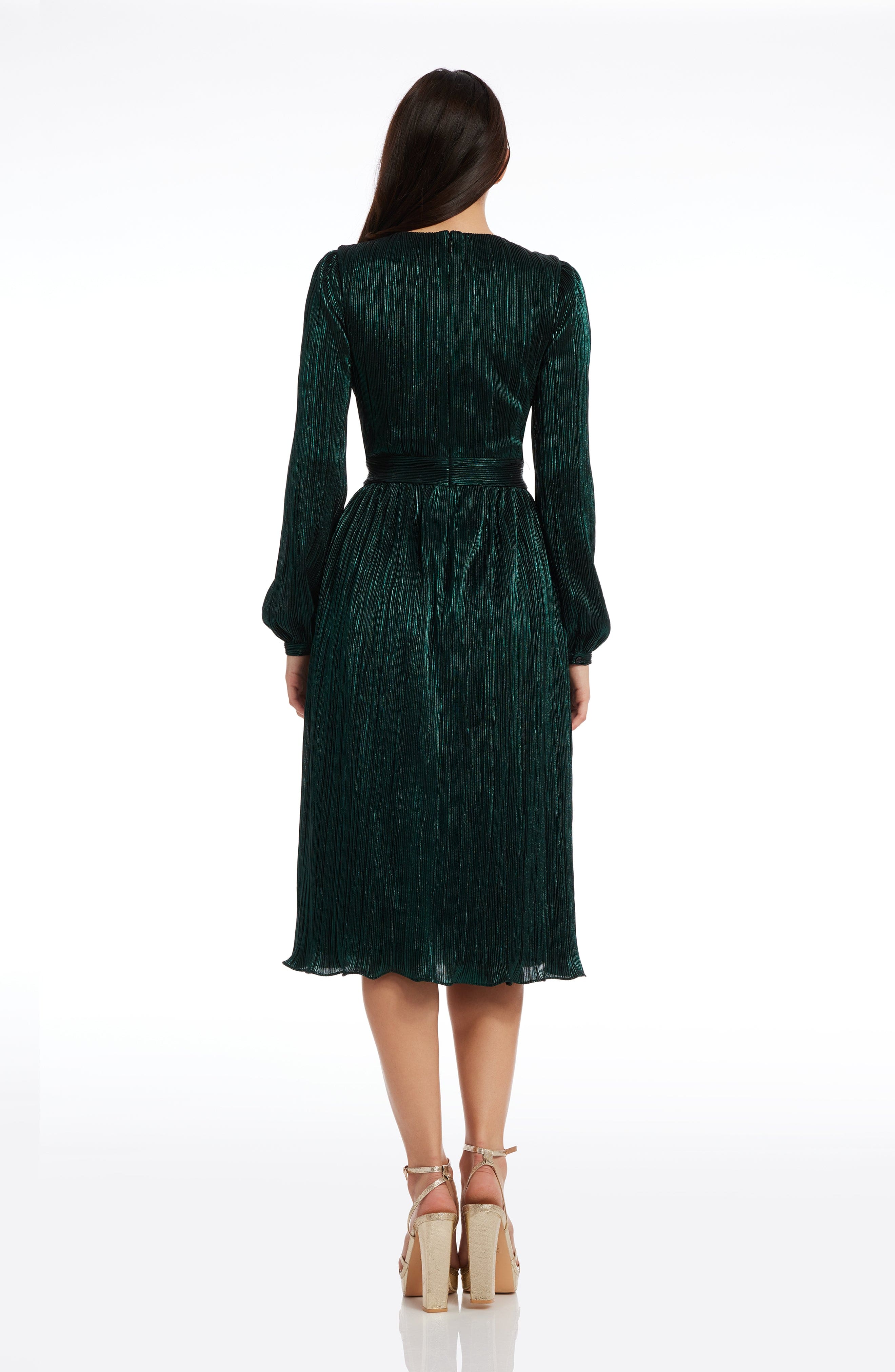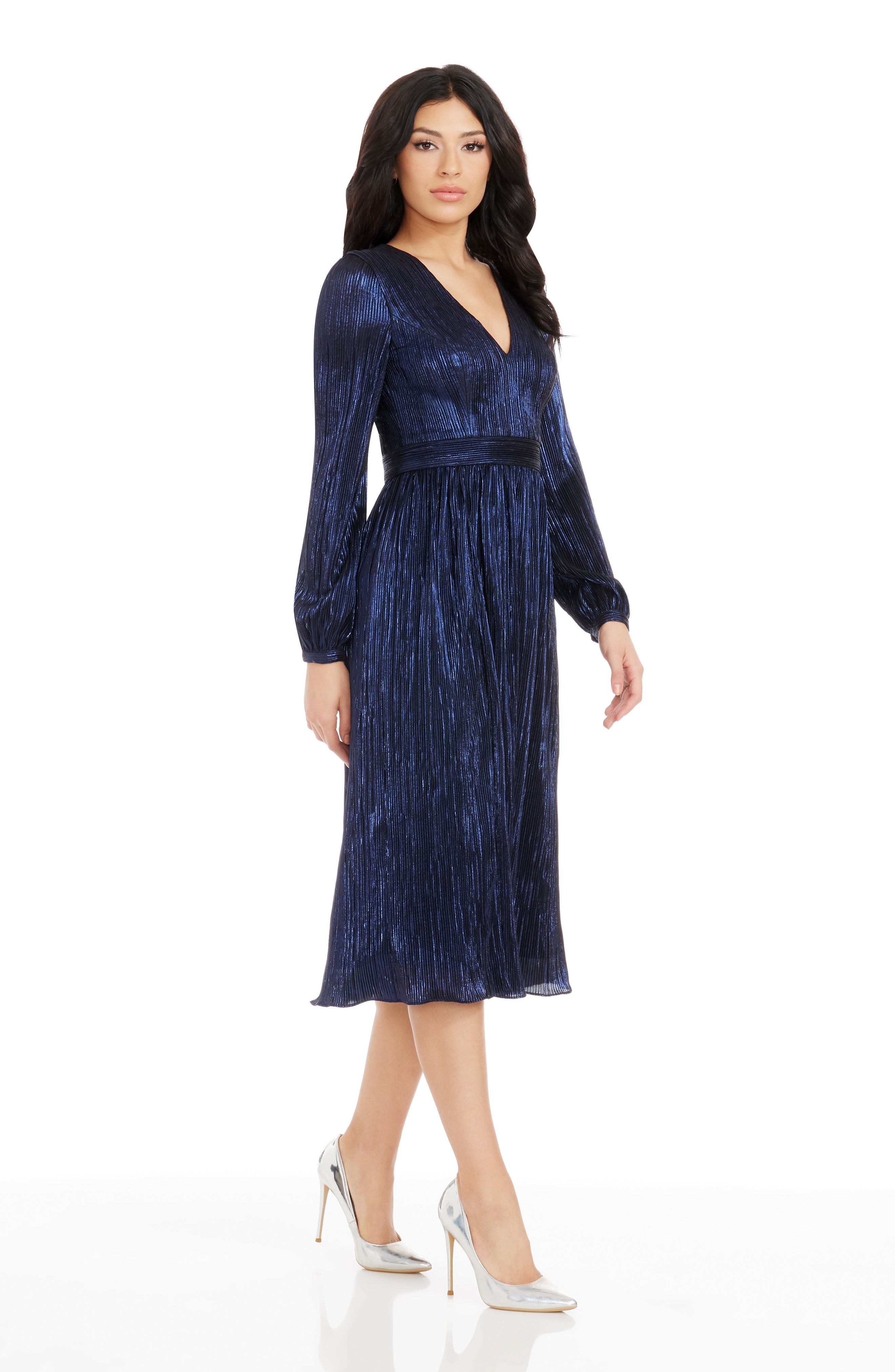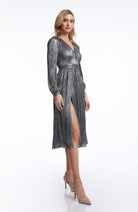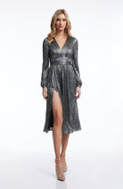 The Holly Dress from features a flattering fit and flare silhouette. With a plunging neckline and bishop sleeve, this midi dress provides an air of elegance and sophistication. Perfect for special occasions or nights out on the town.