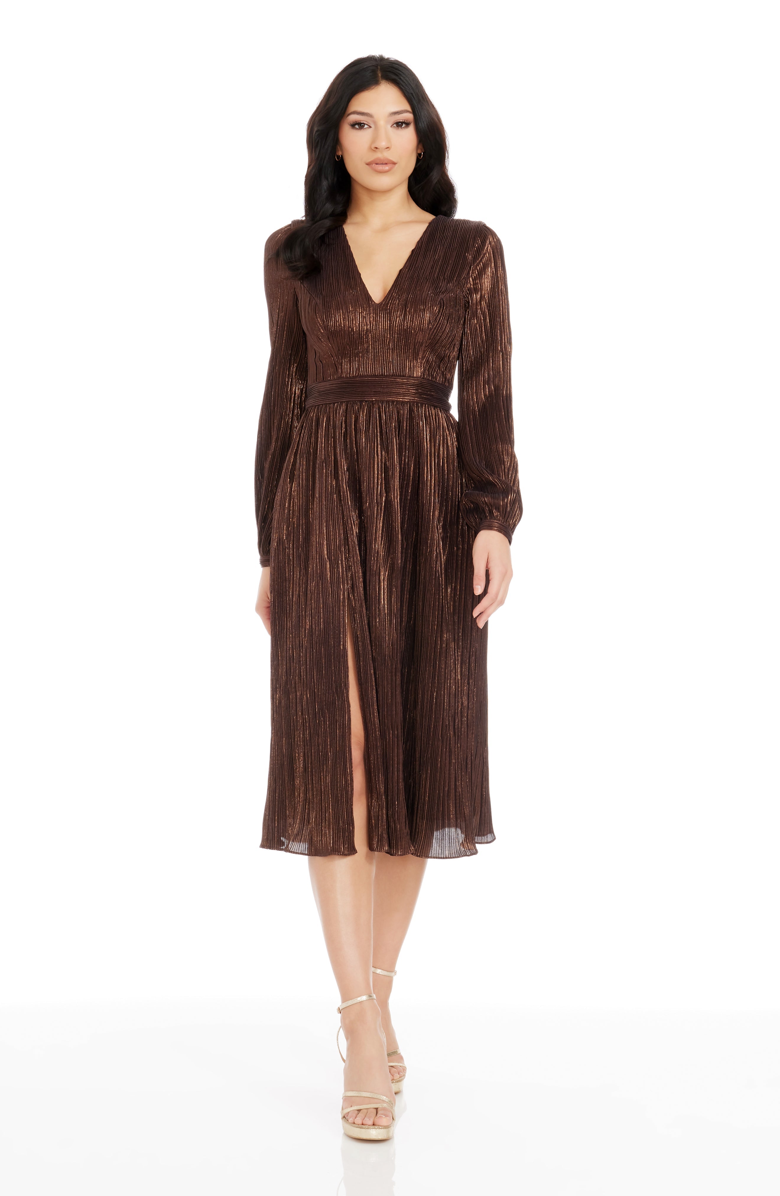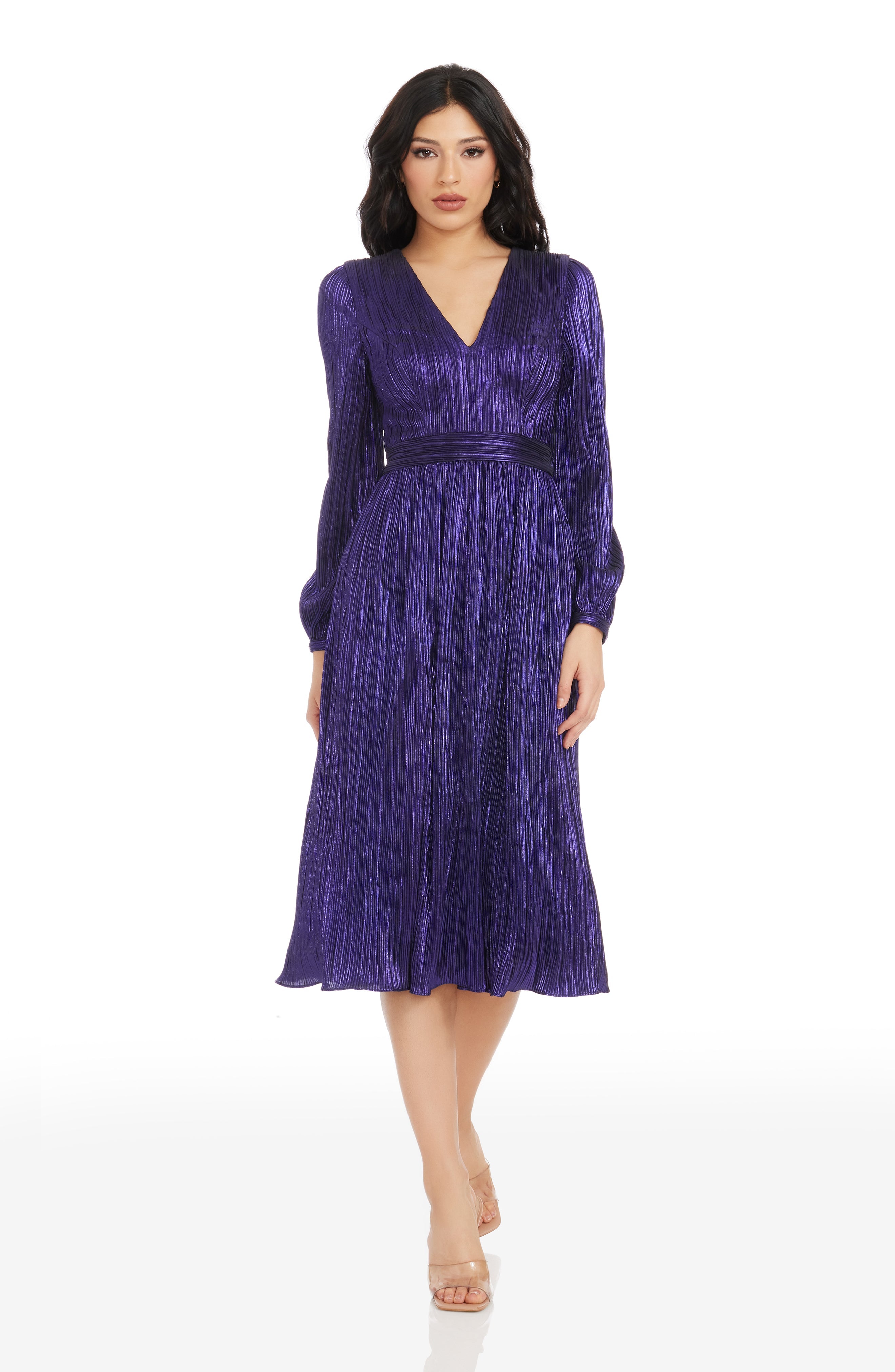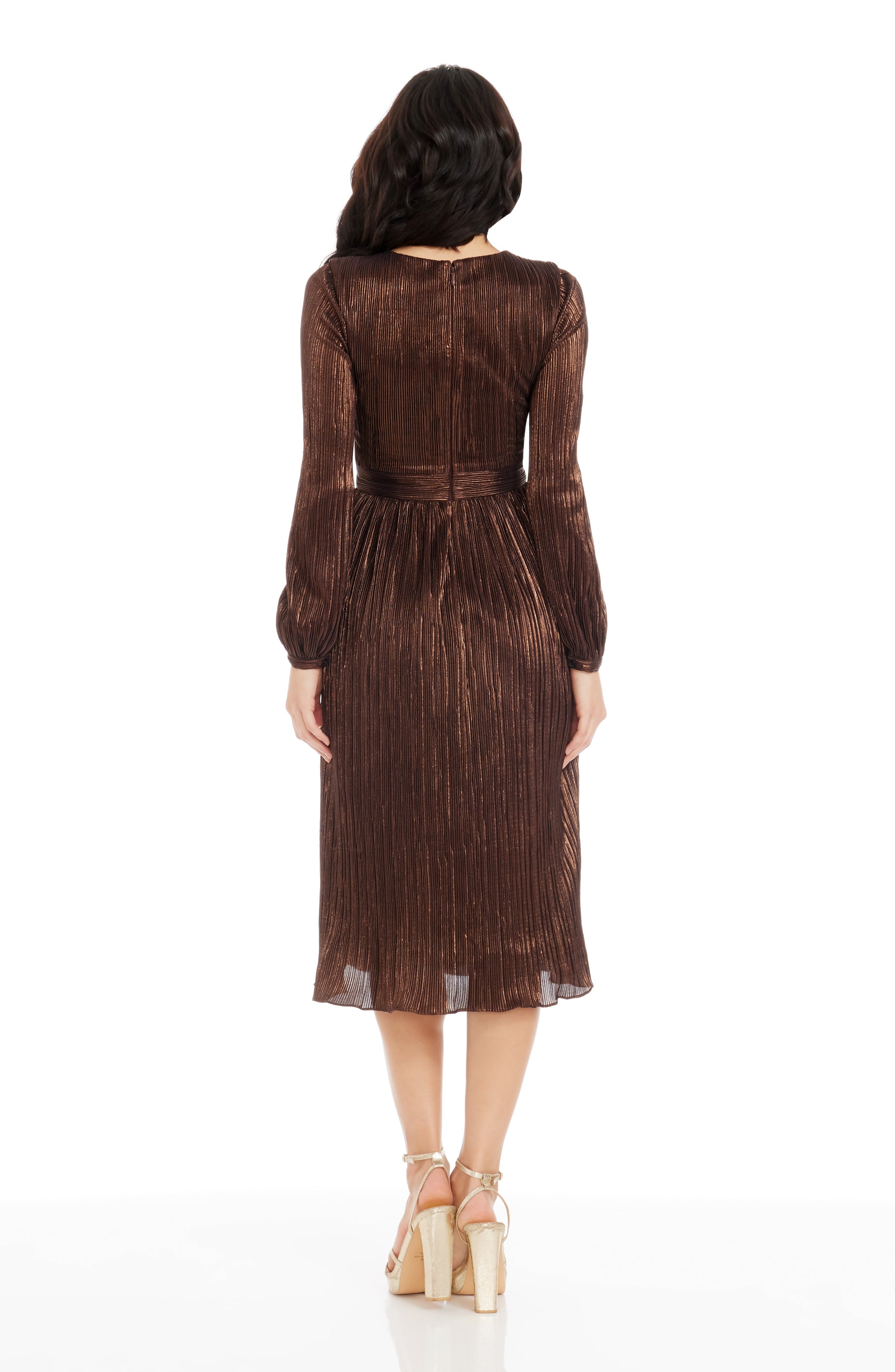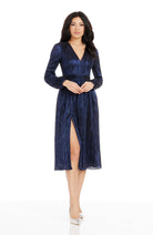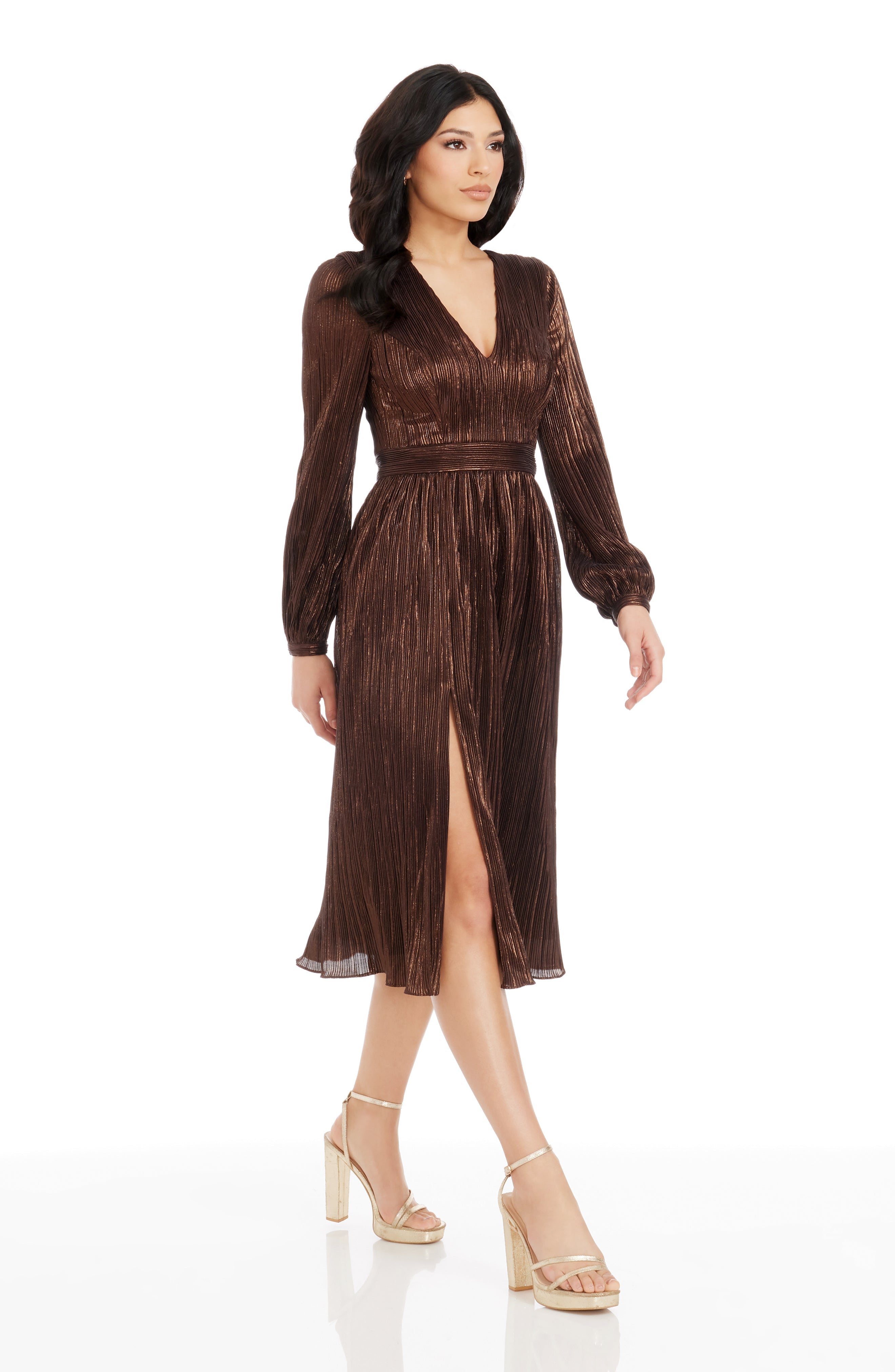 The Holly Dress from features a flattering fit and flare silhouette. With a plunging neckline and bishop sleeve, this midi dress provides an air of elegance and sophistication. Perfect for special occasions or nights out on the town.