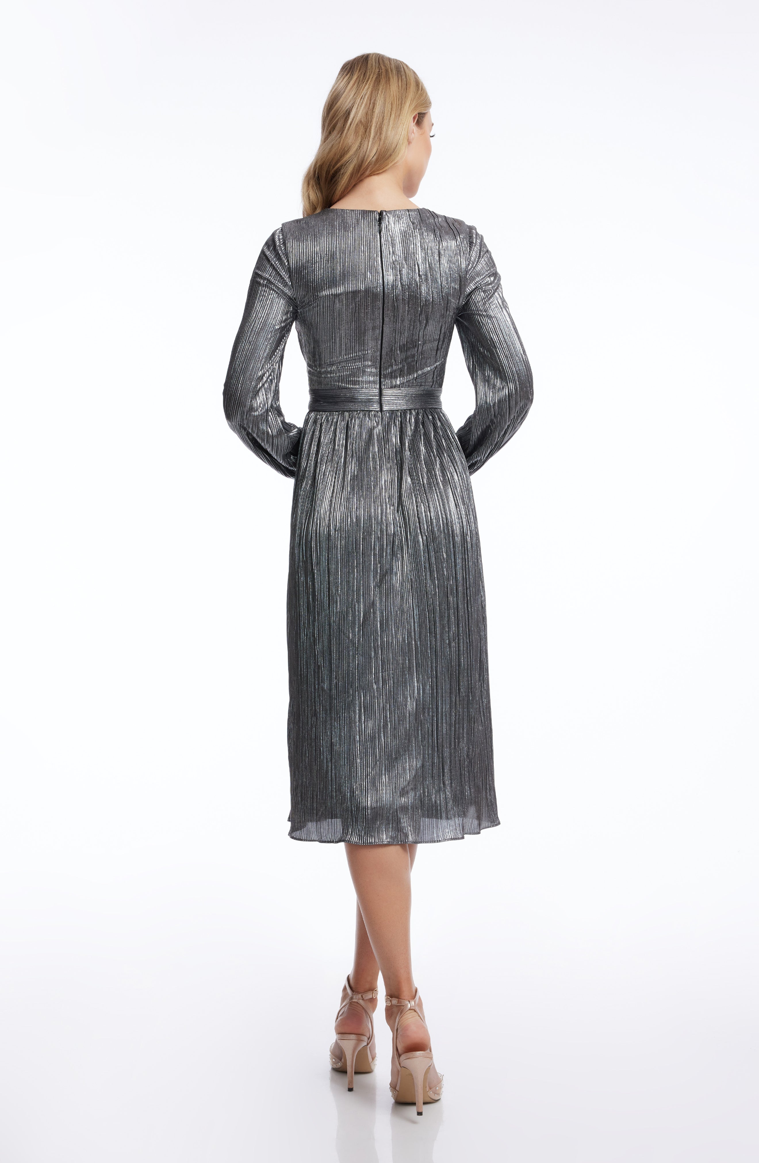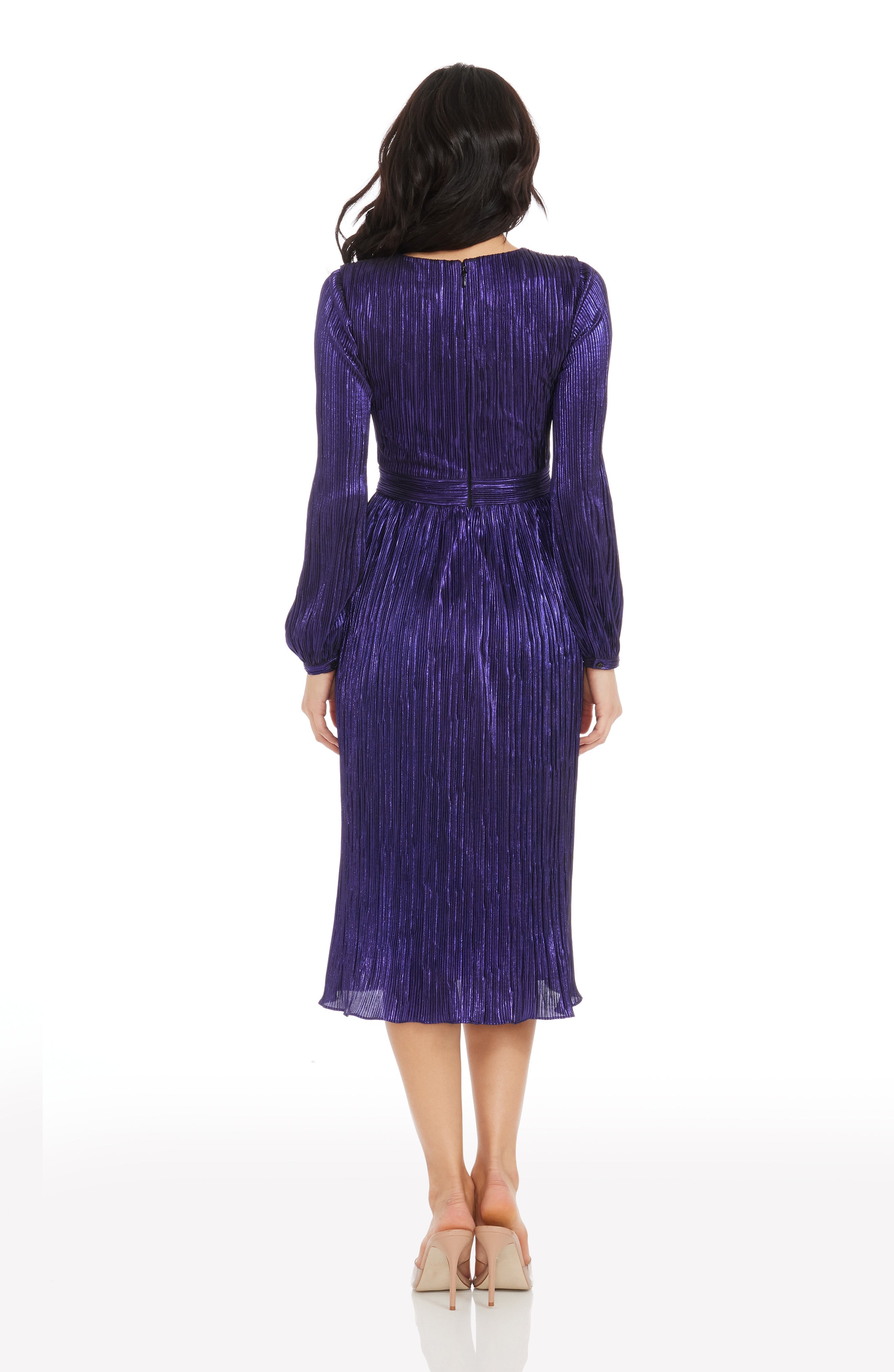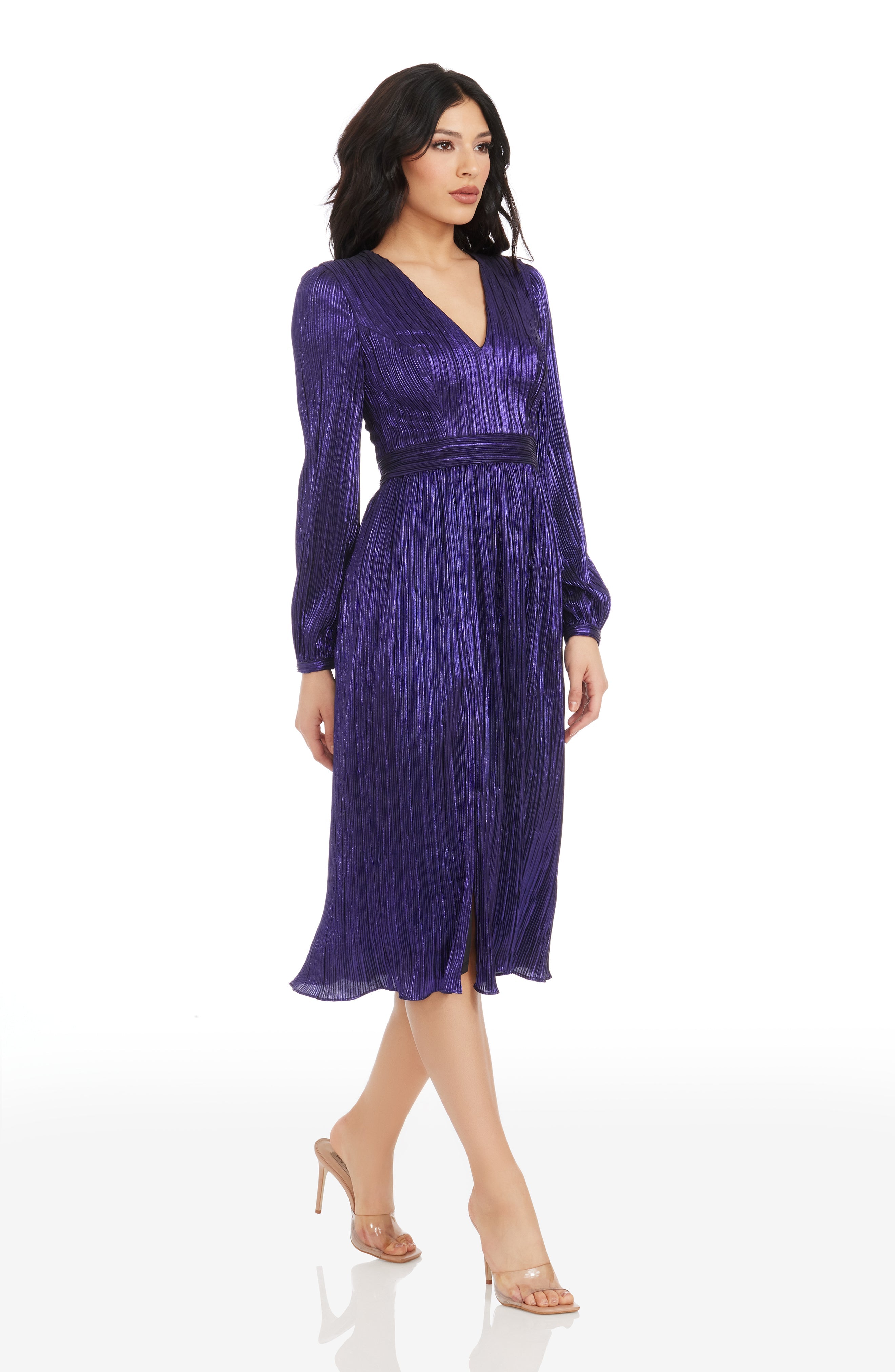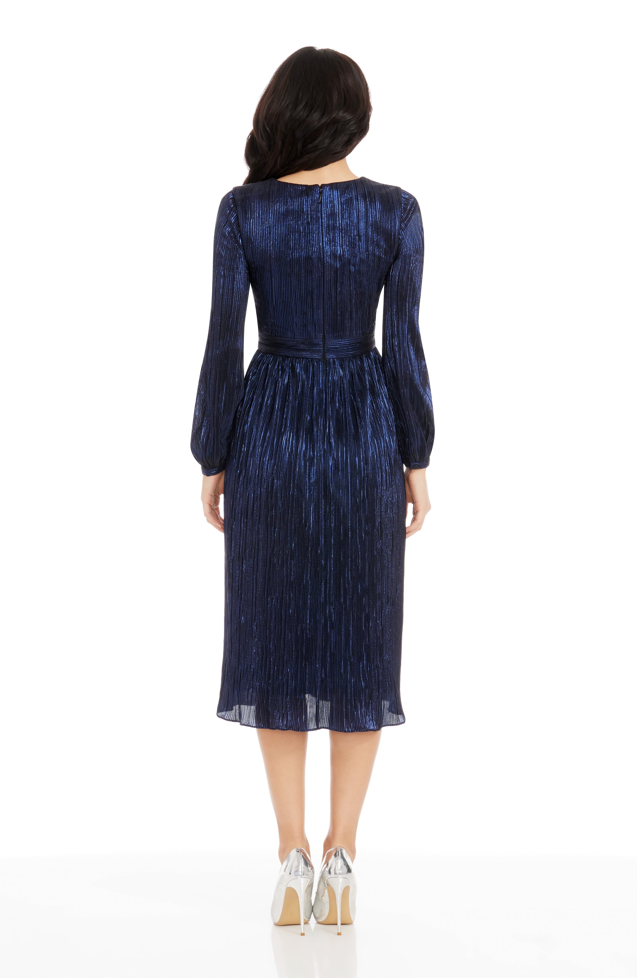The Holly Dress from features a flattering fit and flare silhouette. With a plunging neckline and bishop sleeve, this midi dress provides an air of elegance and sophistication. Perfect for special occasions or nights out on the town.