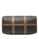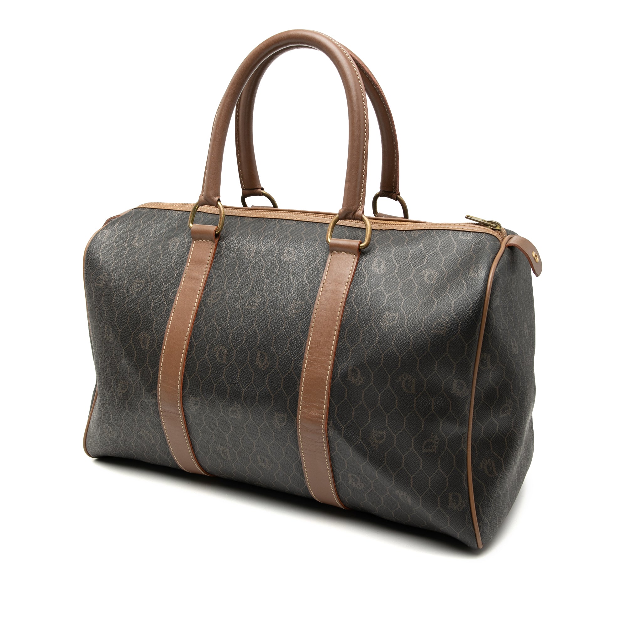 This boston bag features a coated canvas body with leather trim, rolled leather handles, a top zip closure, and an interior zip pocket.