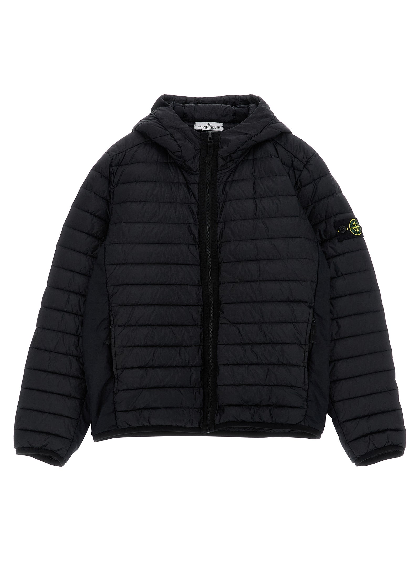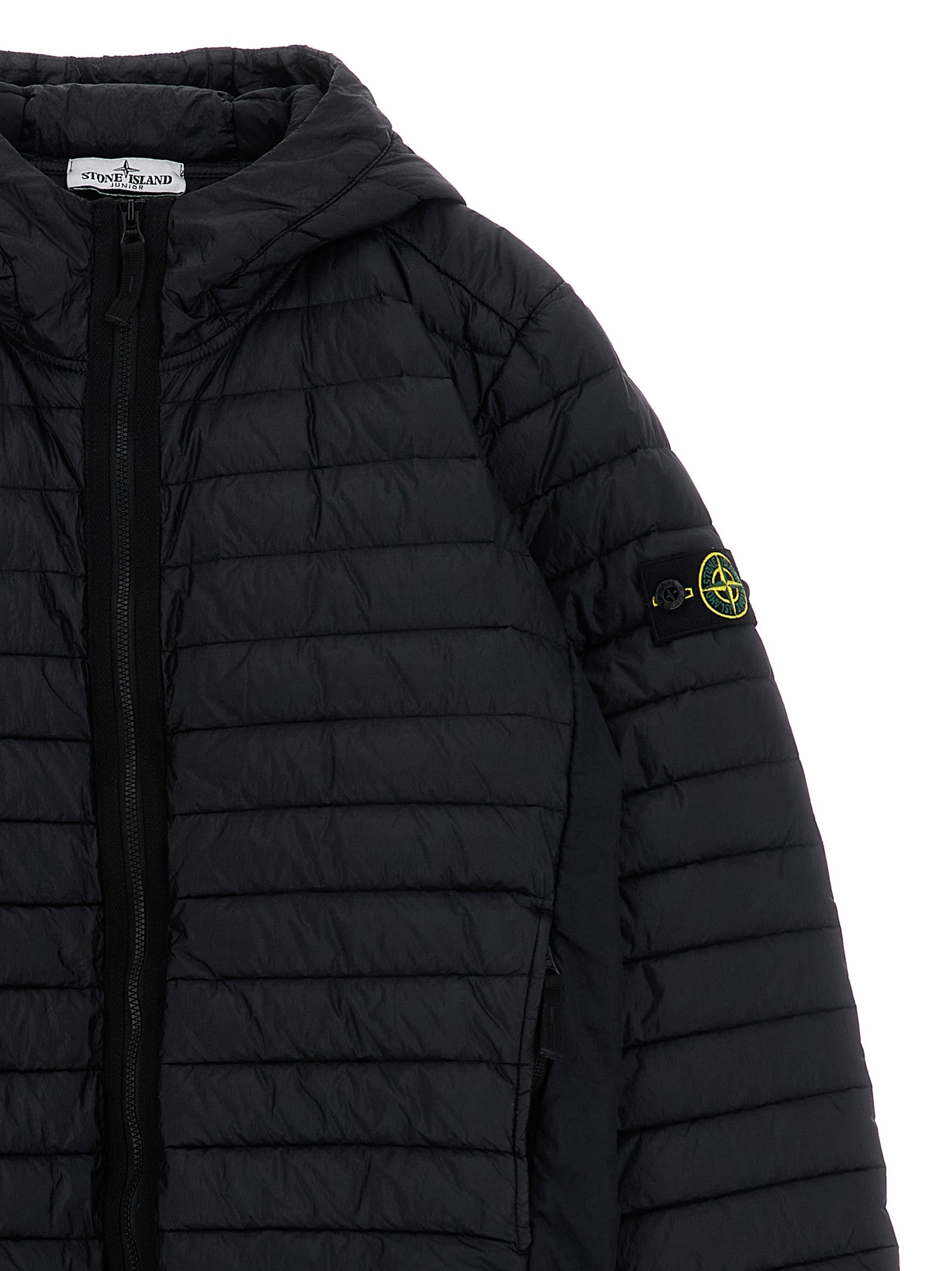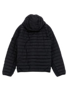 Stay warm and stylish with this hooded down jacket from Stone Island Junior. Crafted from quilted technical fabric with goose feather padding, this jacket offers superior insulation for cold weather days.