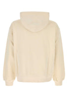 HOODED SWEATSHIRT MADE FROM A SOFT CREAM-COLORED FABRIC. IT FEATURES AN ADJUSTABLE HOOD AND A KANGAROO POCKET ON THE FRONT.