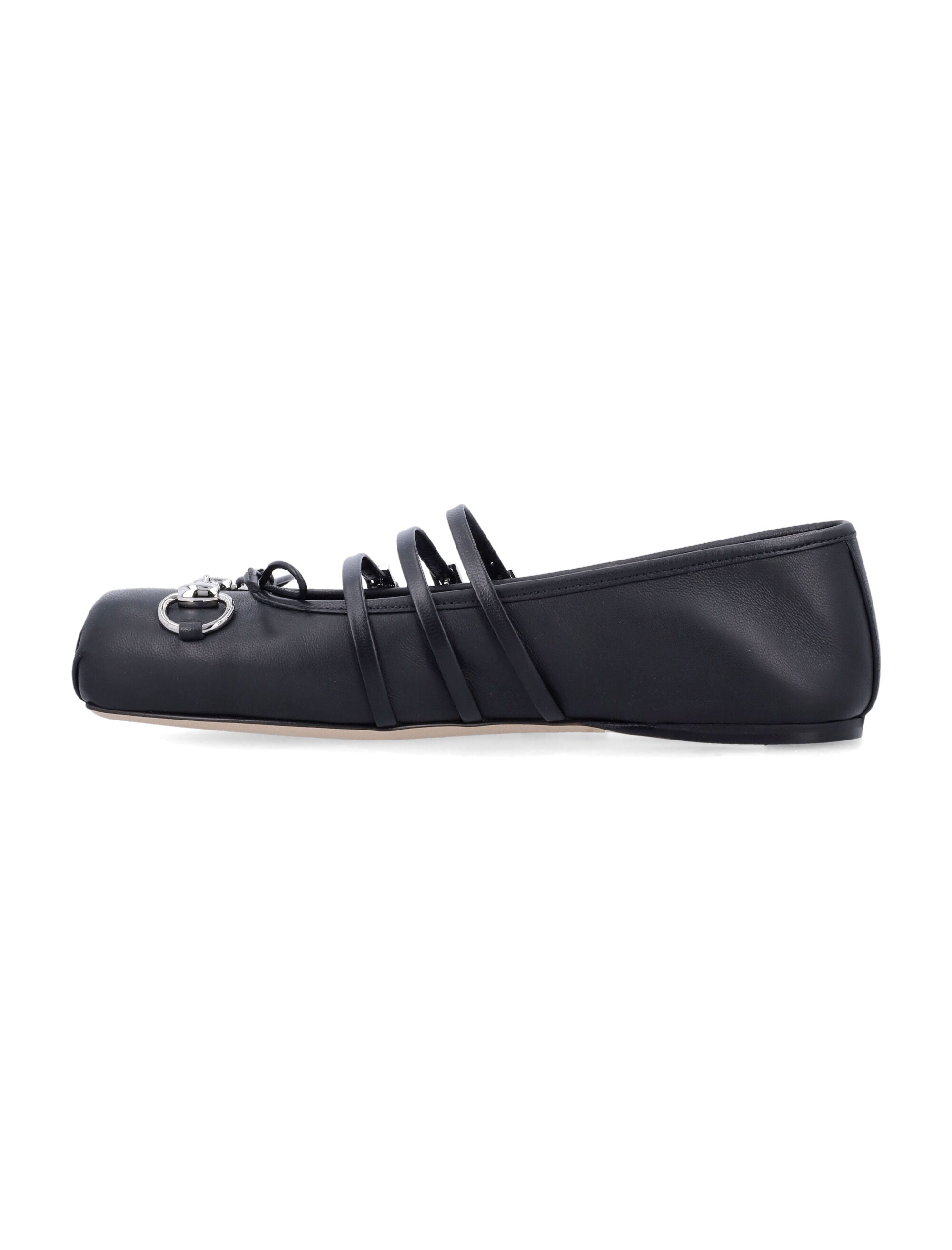 Elevate your everyday style with the Horsebit Nappa Ballerina by Gucci. Crafted from luxurious nappa leather, these sophisticated ballet flats feature a modern square toe and an iconic silver-tone metal horsebit detail that adds a signature touch of elegance.
