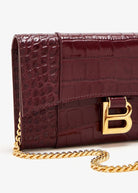 Elevate your evening ensemble with the Balenciaga Hourglass Wallet, a luxurious statement piece that seamlessly blends sophistication with functionality. Crafted in rich burgundy crocodile-embossed leather, this wallet-on-chain features the iconic gold-toned "B" logo clasp that instantly elevates any look.