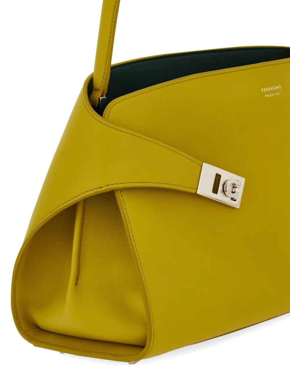 Elevate your everyday style with this stunning Ferragamo shoulder bag in a vibrant chartreuse hue. This structured design features the brand's signature hardware detailing with distinctive metallic clasps that add a touch of sophistication to the clean, architectural silhouette.