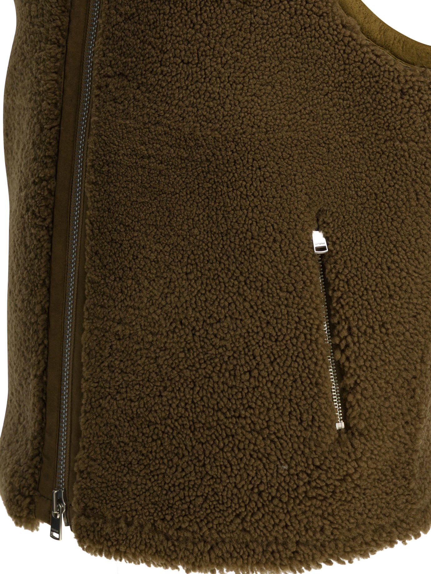 Elevate your layering game with the "Hunter" Sleeveless Jacket from Nonnative. This versatile vest features a luxurious sherpa fleece construction in a rich olive tone, offering exceptional warmth and texture for transitional weather. The regular fit silhouette includes a full-length front zipper with a high collar for added protection against the elements, plus a convenient chest pocket for essentials.