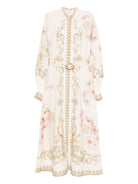 STAND COLLAR FUNCTIONAL CENTRE FRONT PLACKET WITH ROULEAU BUTTON LOOPS REMOVABLE BUCKLE BELT INVISIBLE ZIP AT CENTRE BACK RAFFIA TRIM AT CUFFS THE MODEL IS WEARING SIZE 0 100% LINEN MADE IN CHINA