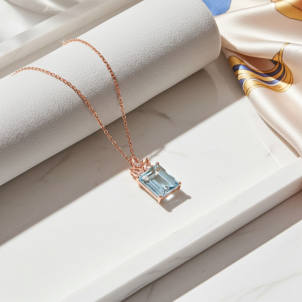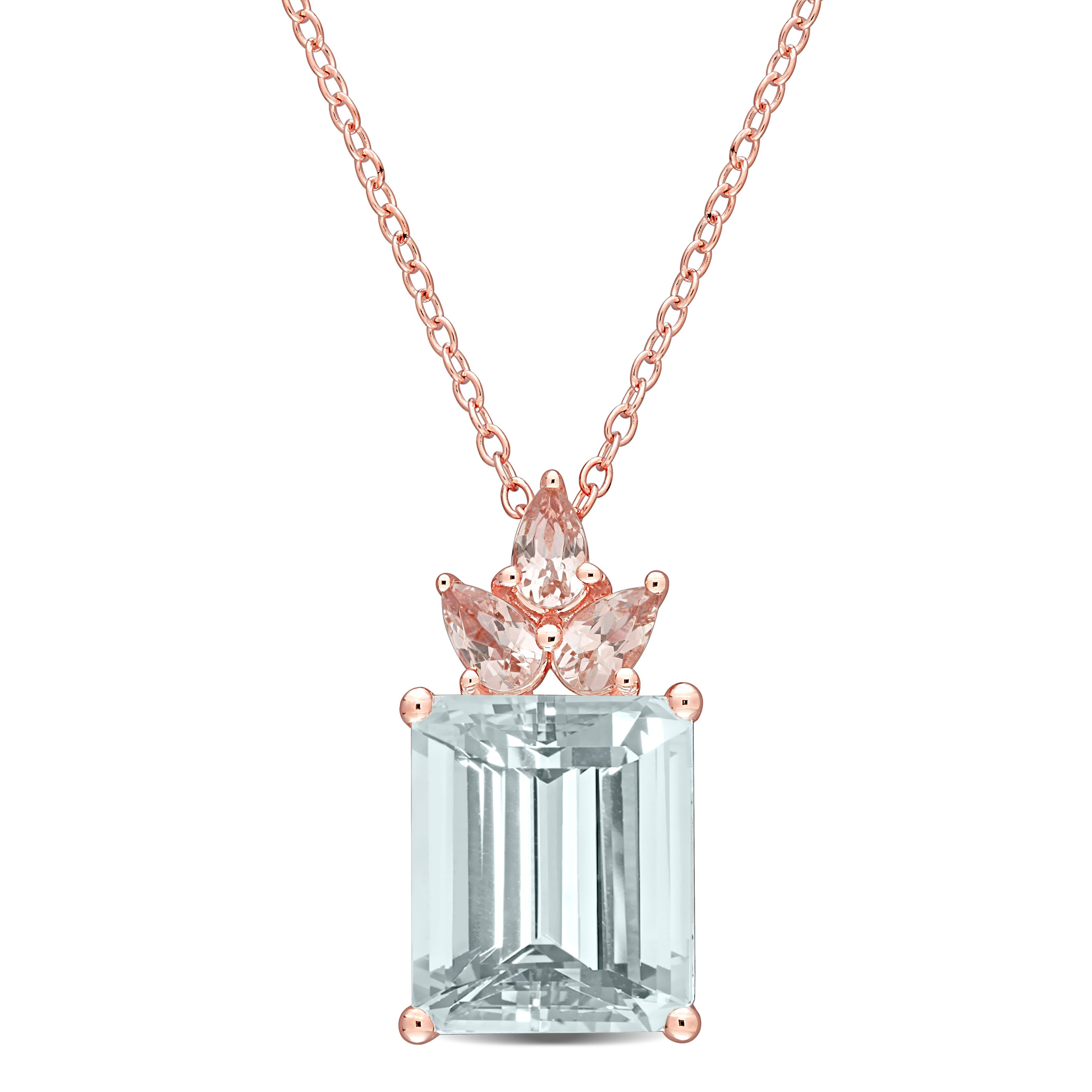 Ice Aquamarine & Morganite Rectangular Drop Necklace in Rose Plated Silver
