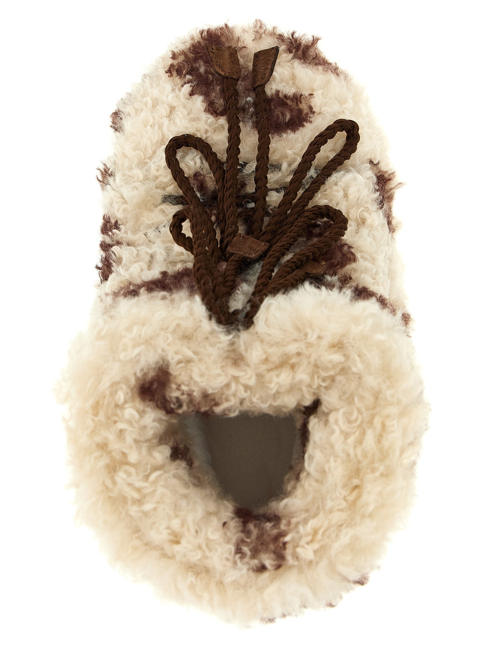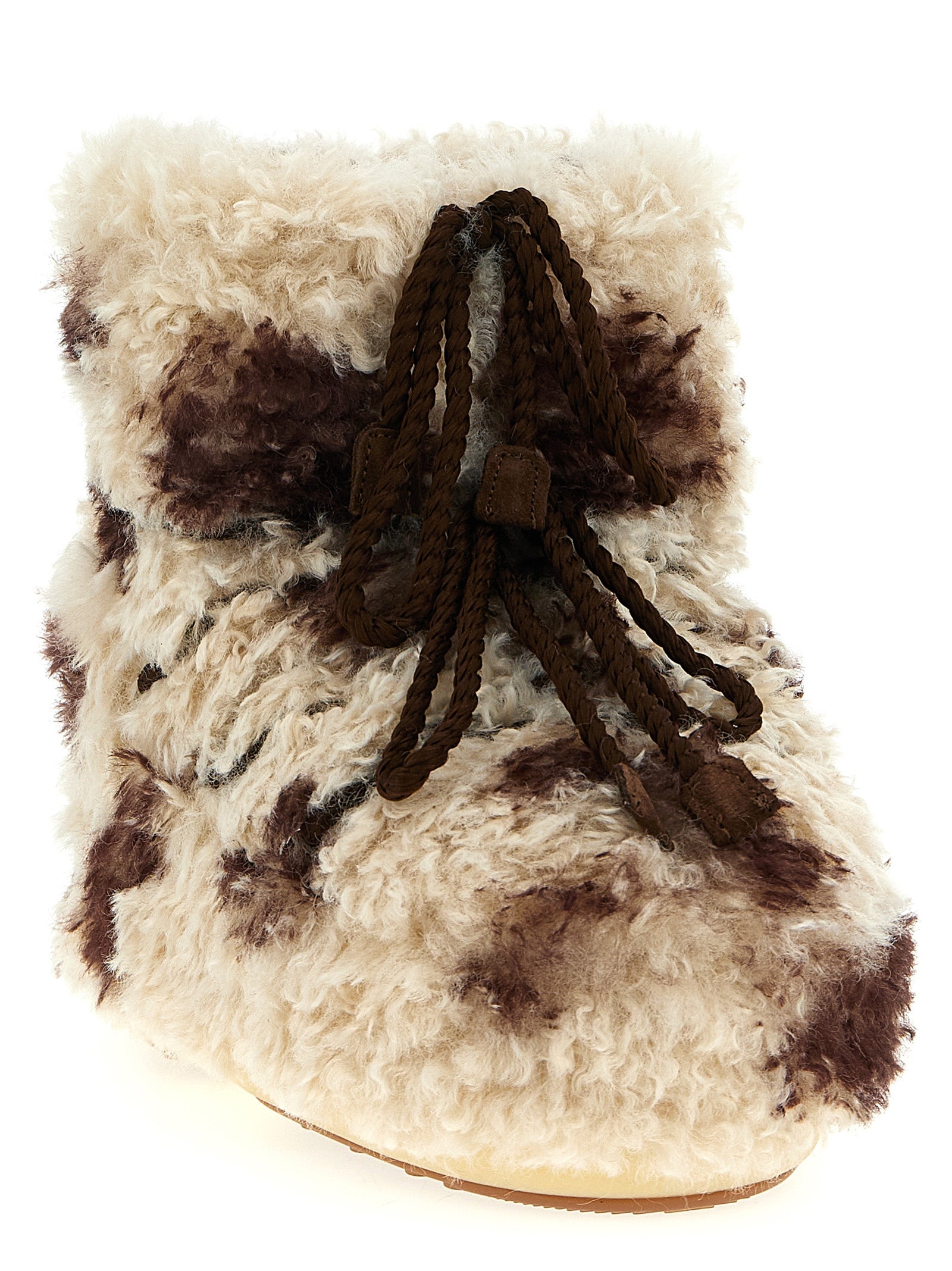 Step into cozy luxury with the 'Icon Low Curly Light' ankle boots from Moon Boot. These statement-making boots feature a playful fur-effect fabric in a chic spotted pattern, combining fashion-forward style with exceptional warmth and comfort.