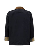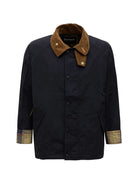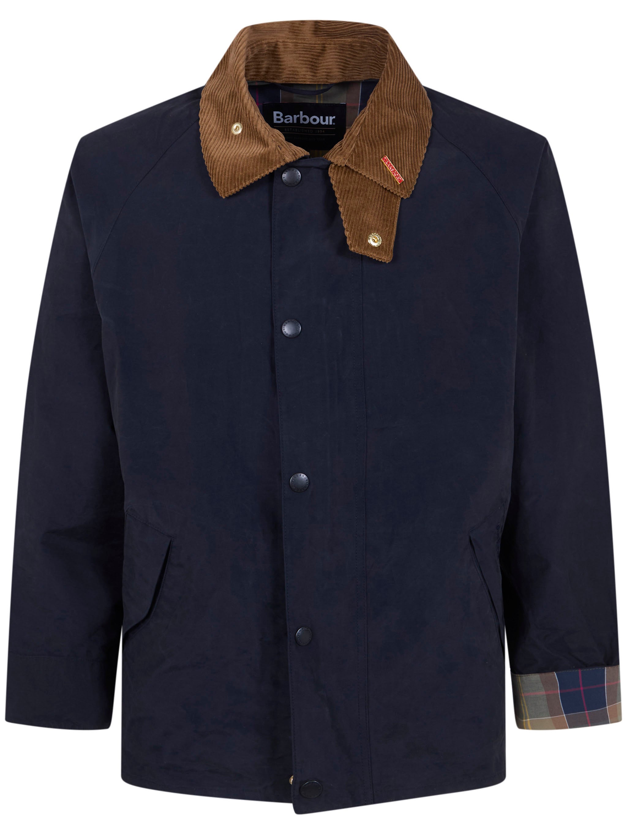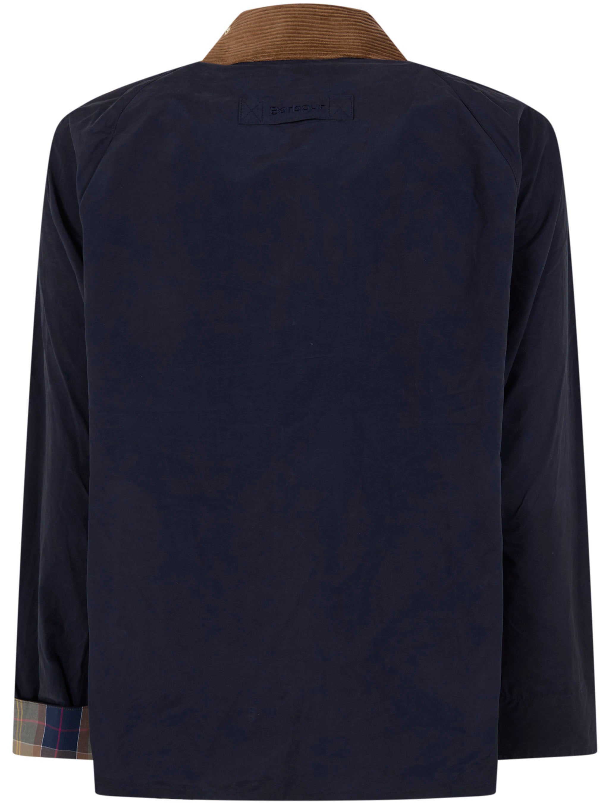 Introducing the Barbour "Icons Transport" Casual Jacket, a timeless piece that combines heritage craftsmanship with modern versatility. This navy jacket features a distinctive brown corduroy collar and classic tartan-lined cuffs, showcasing Barbour's signature attention to detail.