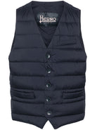 PRUSSIAN BLUE DOWN-FEATHER FILLING QUILTED LIGHTWEIGHT CONSTRUCTION INSULATED DESIGN V-NECK FRONT BUTTON FASTENING SLEEVELESS CHEST WELT POCKET TWO FRONT PATCH POCKETS INTERNAL ZIP-FASTENING POCKETS HIGH-LOW HEM FULL LINING