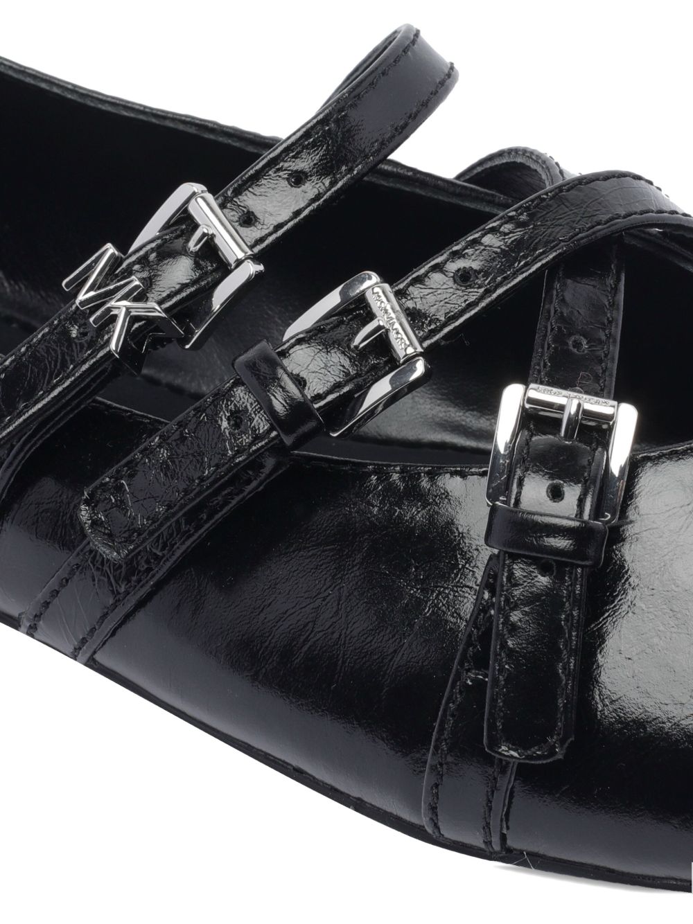 Elevate your everyday style with the INDI FLEX BLACK BALLERINA from MICHAEL Michael Kors. These sophisticated ballet flats feature sleek black patent leather construction with elegant decorative straps and silver-toned buckle details that add a touch of modern refinement.