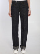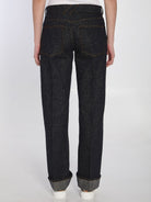 JEANS IN INDIGO DENIM. IT FEATURES A BUTTON CLOSURE, SILVER-TONE METAL BELT LOOP DETAIL WITH AN ENGRAVED MONOGRAM ON THE FRONT, BELT LOOPS, FIVE POCKETS, STRAIGHT LEGS, AND A CANVAS DETAIL ON THE INSIDE HEM WITH BURBERRY LETTERING.