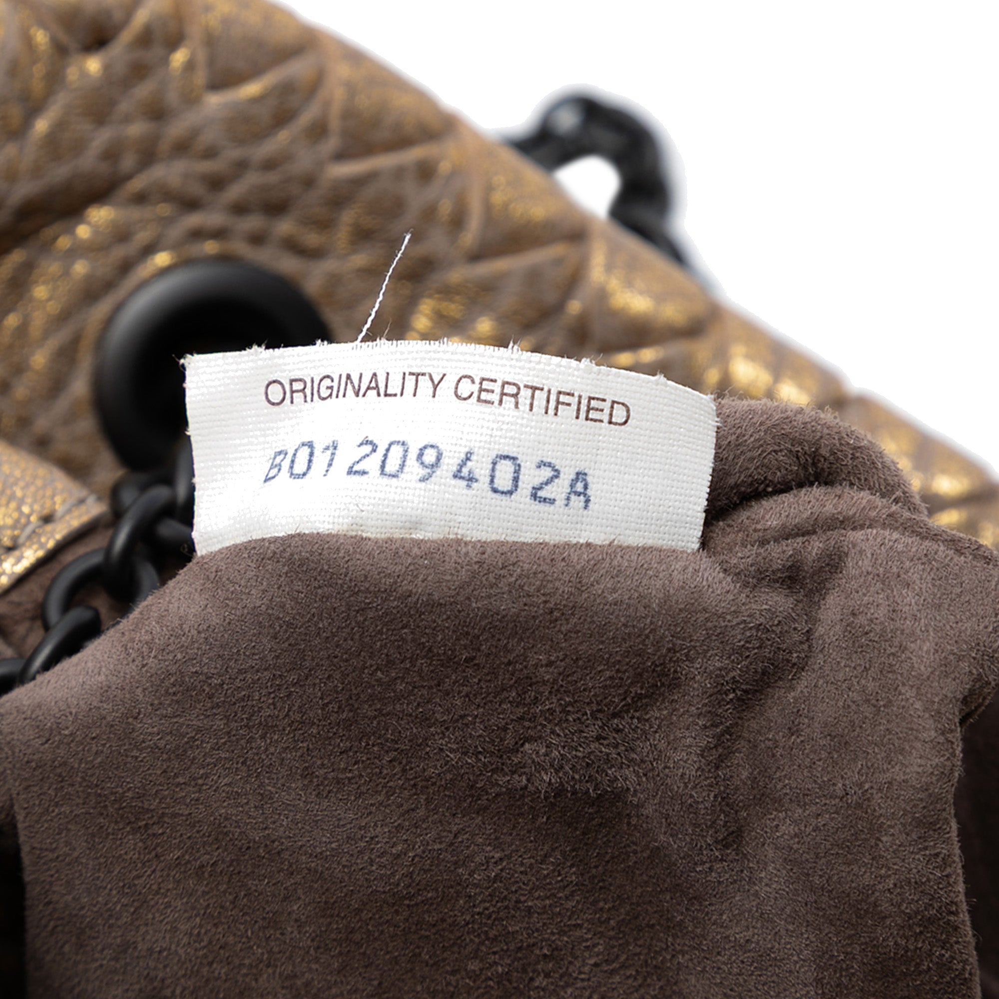 The Duo shoulder bag features a metallic leather body, curb chain link straps with leather guard, and an open top with magnetic frame closure.
