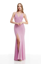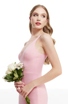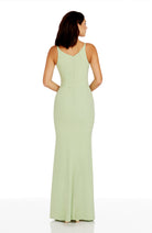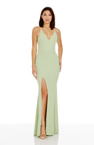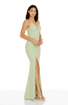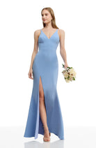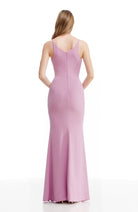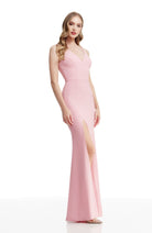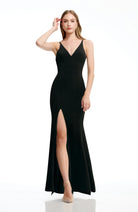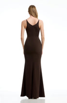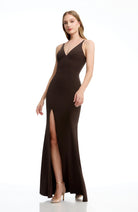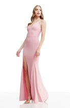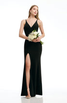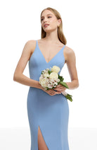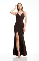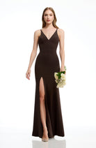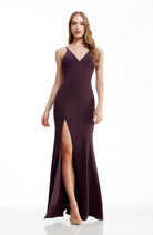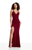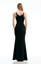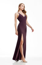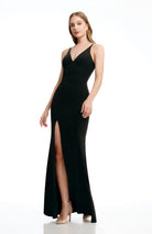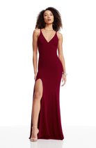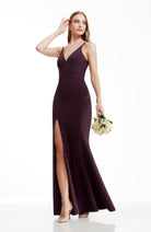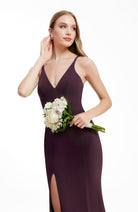 Accentuate your figure in this curve-hugging, sophisticated crepe gown. Iris is a floor-length dress with a sexy side slit. This sleeveless dress features a deep v-back and a plunging neckline, which is highlighted by thin should straps. The gown has a snug fit through the bodice and hips.