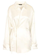 Ivory wrap shirt in advanced bio-technical silk satin. It features an asymmetric construction, a point collar, a front button closure with a closed buttonhole, a fabric tie belt, long sleeves with jeweled cuff buttons, Balenciaga embroidery on the right cuff, and a rounded hem. Relaxed fit.