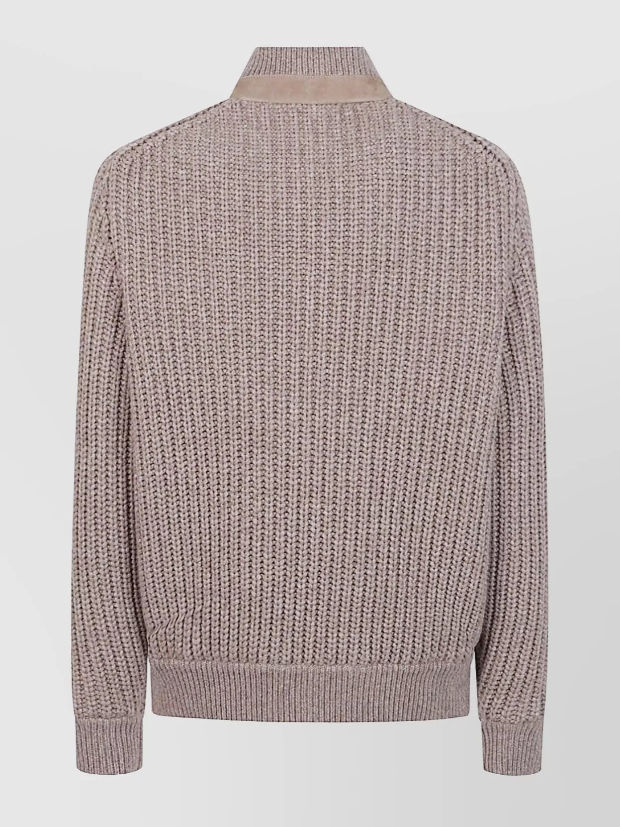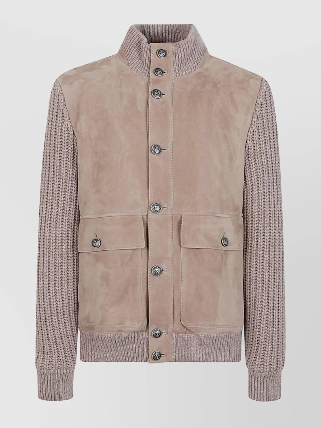This sophisticated jacket from Brunello Cucinelli masterfully combines luxurious suede with finely knit details for a refined take on classic outerwear. The beige suede body features functional chest pockets with button closures, while the ribbed knit sleeves, collar, and hem add textural interest and comfortable flexibility.